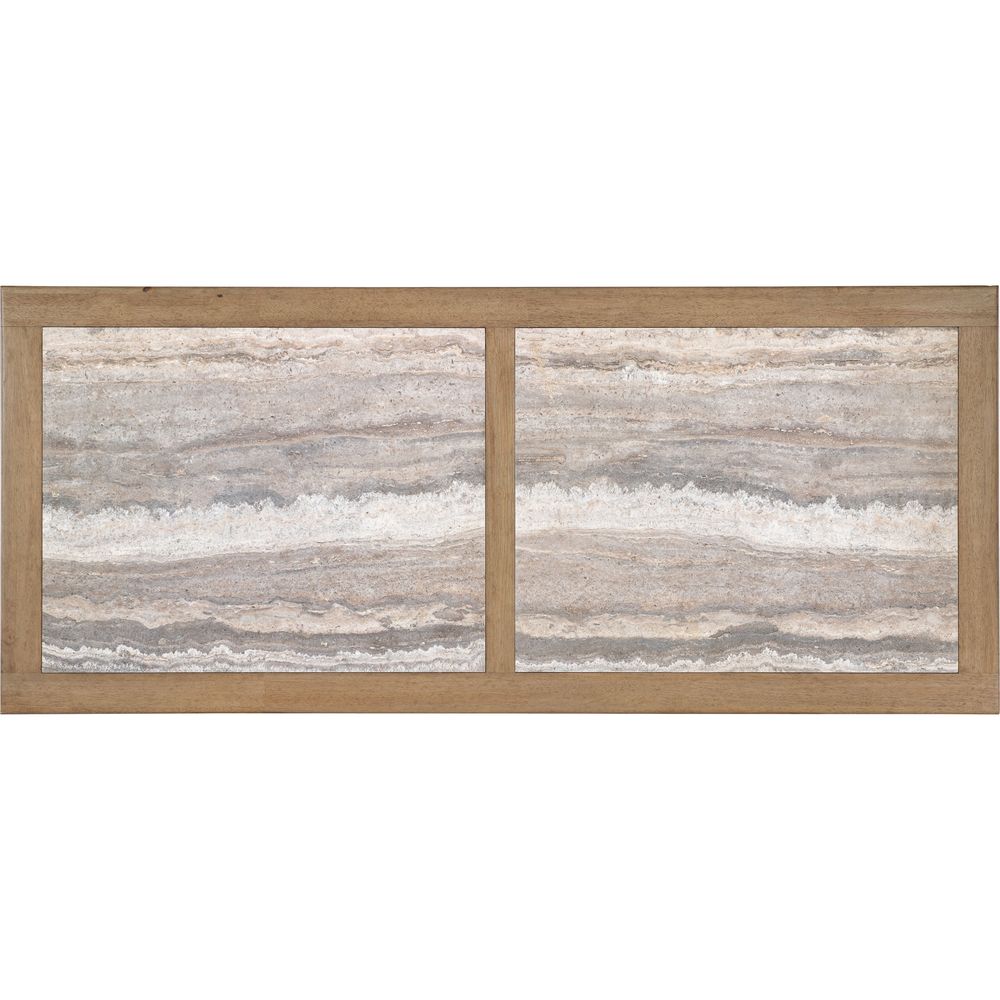 Features: Honed gray travertine stone inset divided top; Counter height; Stretcher; Rectangle shape