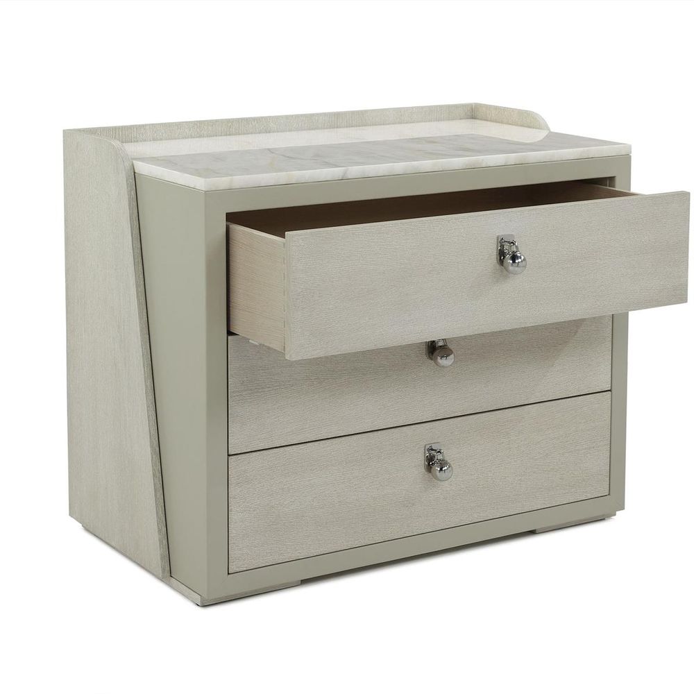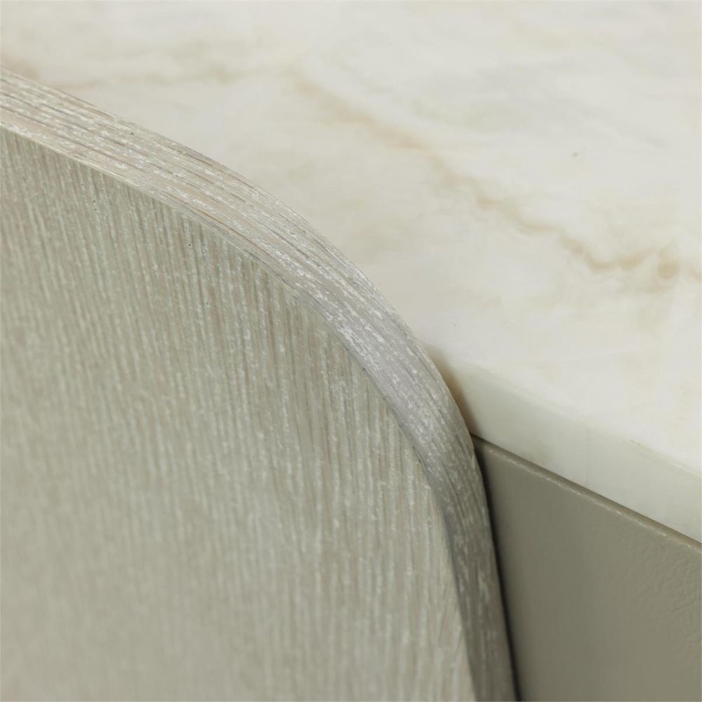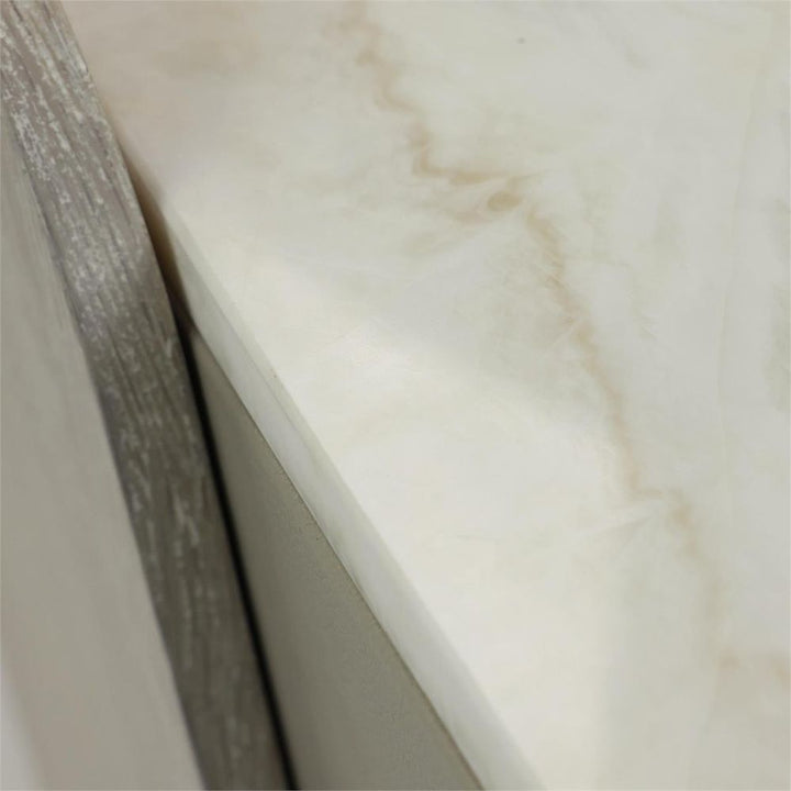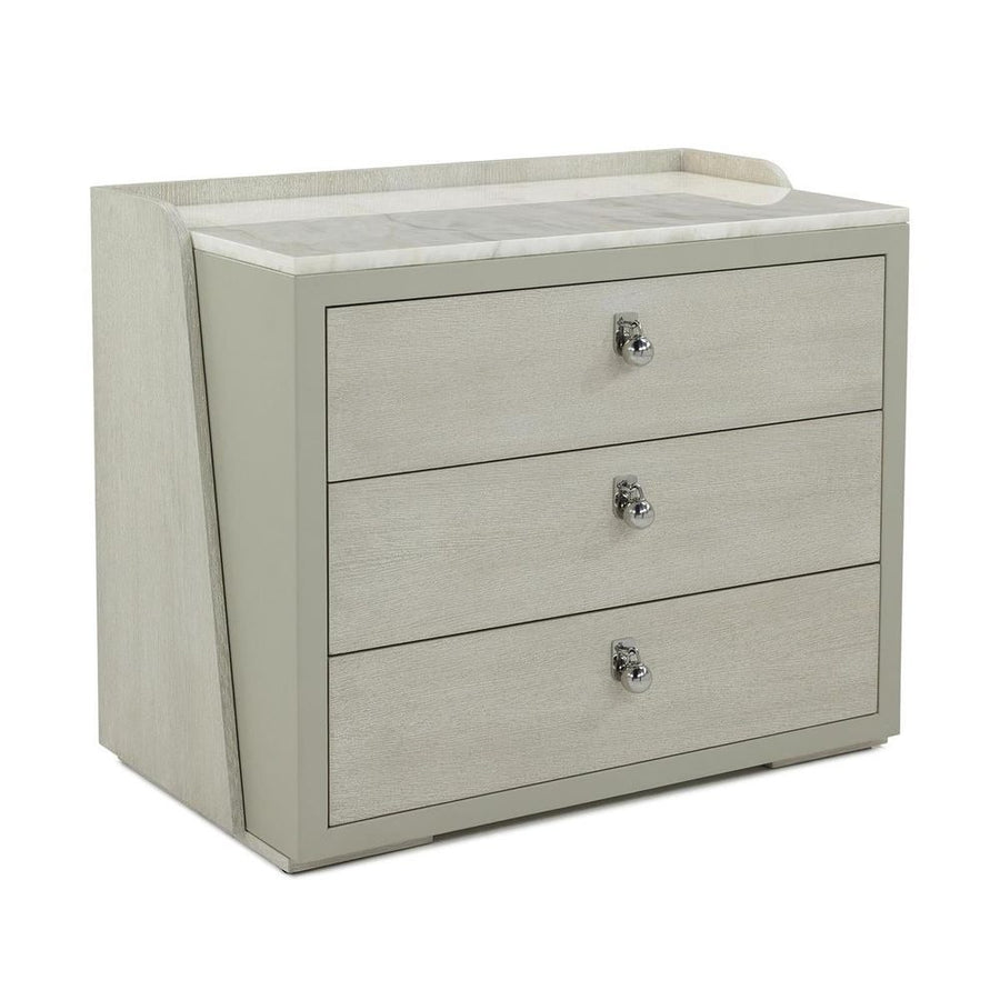 The Urban Dresser is a sleek, contemporary piece that instills an atmosphere of pristine modernity to an interior space. A sturdy oak wood frame featuring an angular profile is adorned in a Grey Washed finish, giving it a delicate cream color that seamlessly blends with a variety of spaces. Each of the three drawers feature soft closing drawer runners, as well as ball handles of Polished Stainless Steel that provide beautiful contrast to the tabletop of white onyx marble.