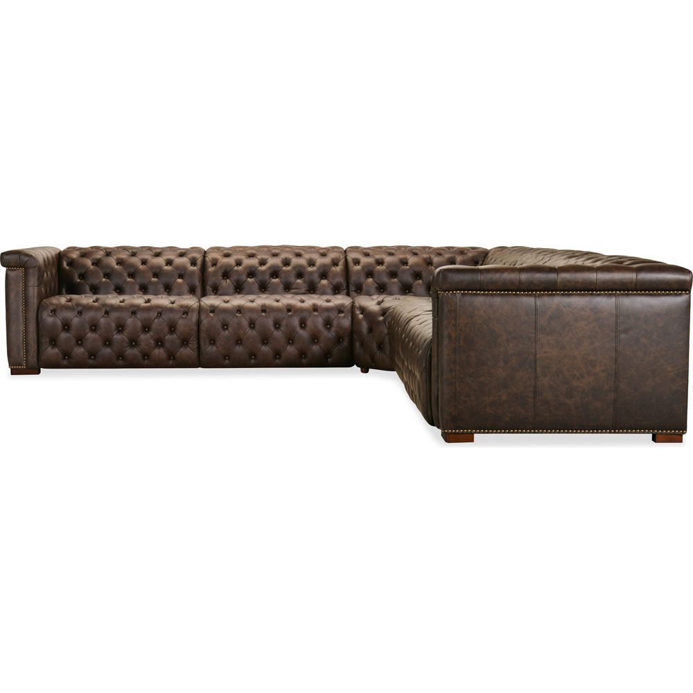 Description: This 5 Seat Sectional from the Savion Deux collection, upholstered in rich West Saddlewood leather, offers four power recliners and six power headrests for ultimate relaxation. Its dark wood finish, paired with classic chesterfield tufting and copper-toned nail trim, enhances the luxurious look. The thoughtfully designed power reclining seats, seamlessly integrated, make this sectional a sophisticated and functional addition to any living room.