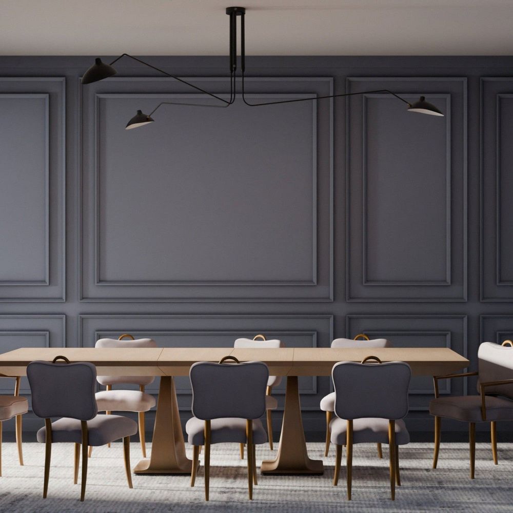 An icon of French design originally from Serge Mouille’s iconic 1958 series, This three-arm lamp combines dramatic shapes and angles to create a theatrical and sculptural feel. The chandelier features a central vertical stem that has three sprawling curved arms of differing lengths that radiate from the center. Each arm is fixed with a chapeau style shade that can swivel, rotate, and tilt, which helps to supply the room with plenty of light. As much a work of art as a source of illumination this piece will look great in modern and contemporary spaces alike. This lamp uses E12 chandelier bulbs to provide the perfect amount of light.