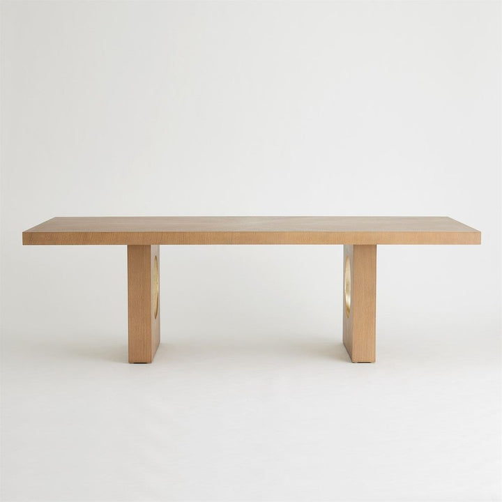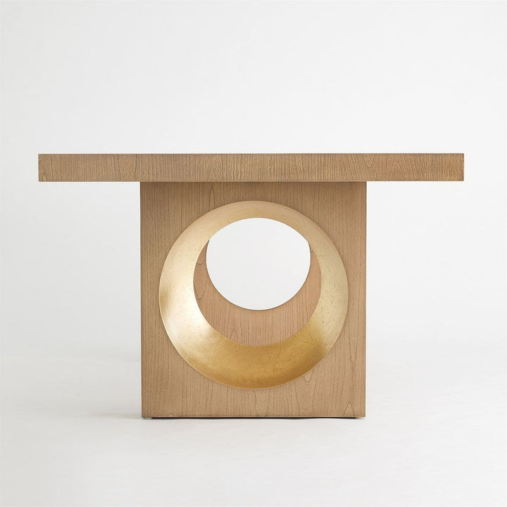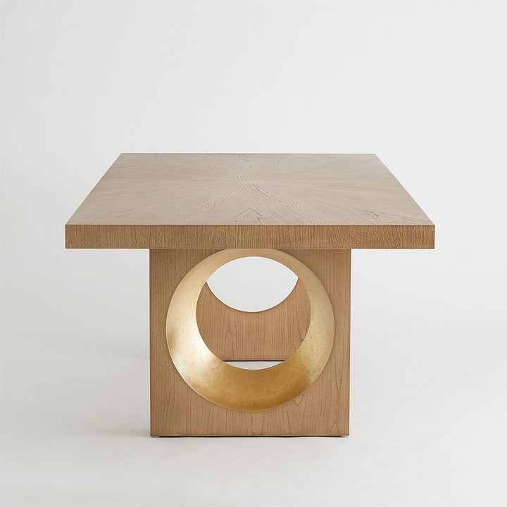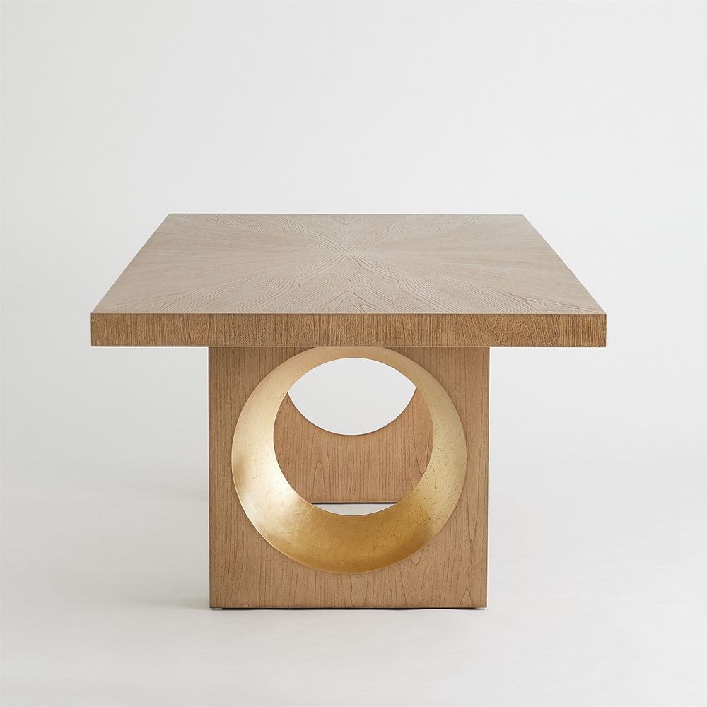 Description: Handcrafted from luxurious mahogany with a nutmeg finish, the Oculus Dining Table exudes contemporary elegance with its sleek design and captivating burst pattern. Enhanced with champagne-toned gold leaf accents, it adds a touch of sophistication to any dining space.