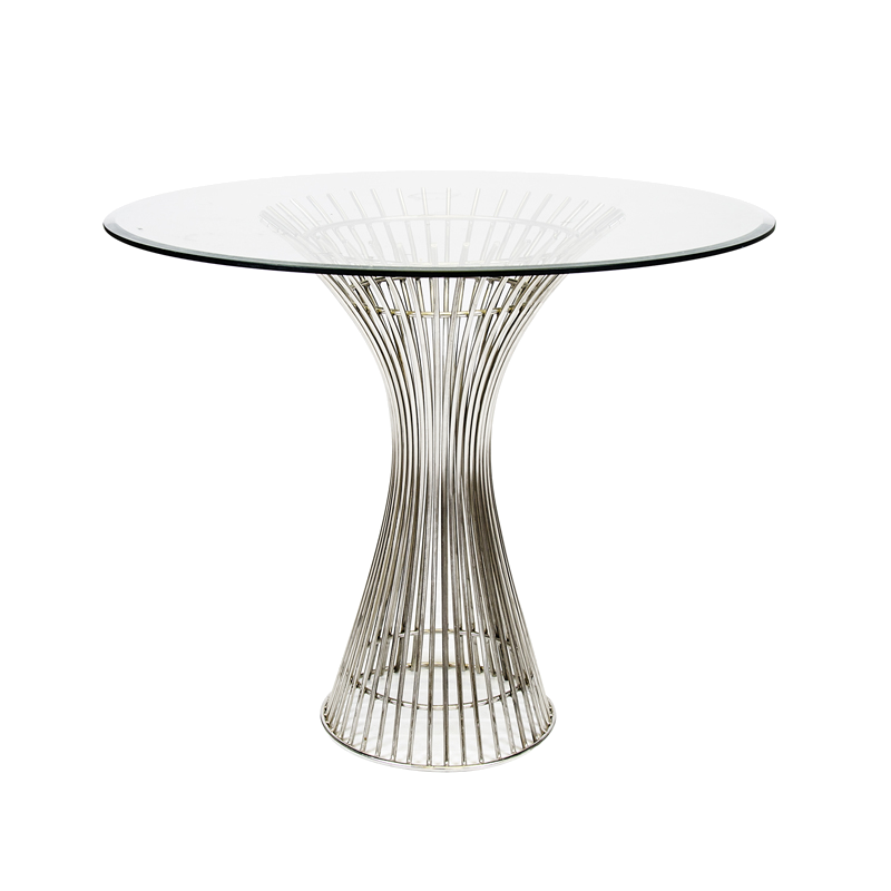 Description: Our round, cage style side table base exudes sophistication and feminine grace. Sweeping iron spindles are crafted from stainless steel for a sleek, modern profile. Curvaceous, clean, and comely, Powell is truly sublime. Base only *Please note this table is not made for larger than a 42" diameter glass top. Diameter: 20"