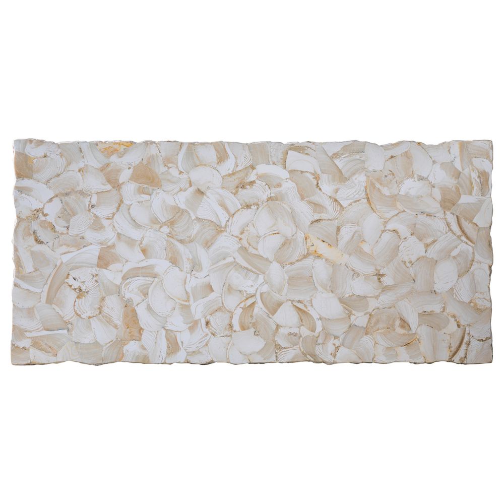 Feature 1: Contemporary live-edge dining table featuring a slab top two inches thick, inlaid with fossilized White Clam shell and standing on simple iron sled bases in a silver finish with a hint of gold. While fossilized shell items vary from piece to piece, we have selected a color range for the veneered tops on the Caldera pieces that will result in beautiful earth tones. Fossilized shell coloration will vary from top to top.