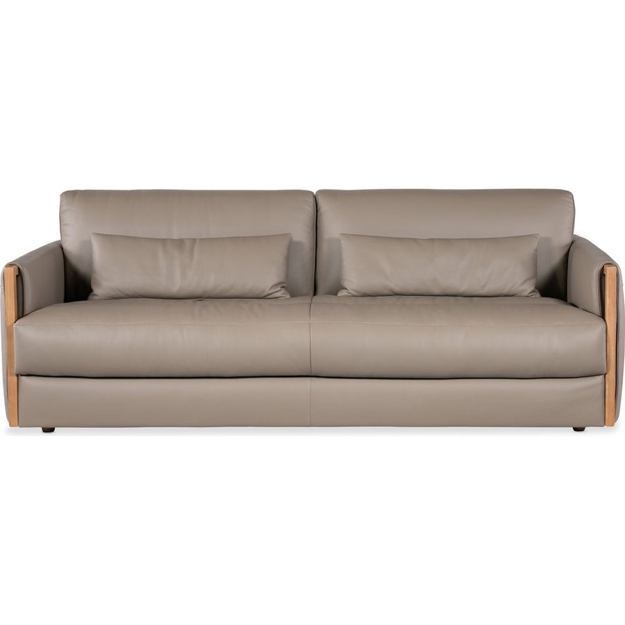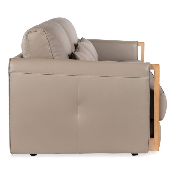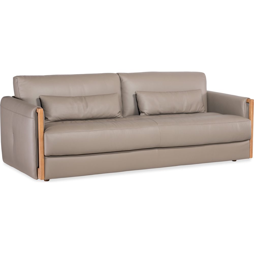 Description: In a light and airy modern style, the Lattice Sofa has exposed wood trim on the arm fronts and is covered in the soft-colored Miami Truffle semi-aniline top grain leather, accented by designer topstitch trim and two kidney pillows.