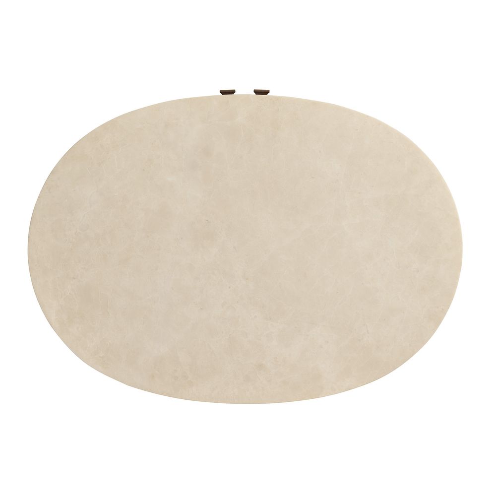 Feature 1: The Morella oval nightstand features dimensional walnut burl around the perimeter and a solid Bulgari Beige marble top. Behind the two doors is a stationary storage shelf.