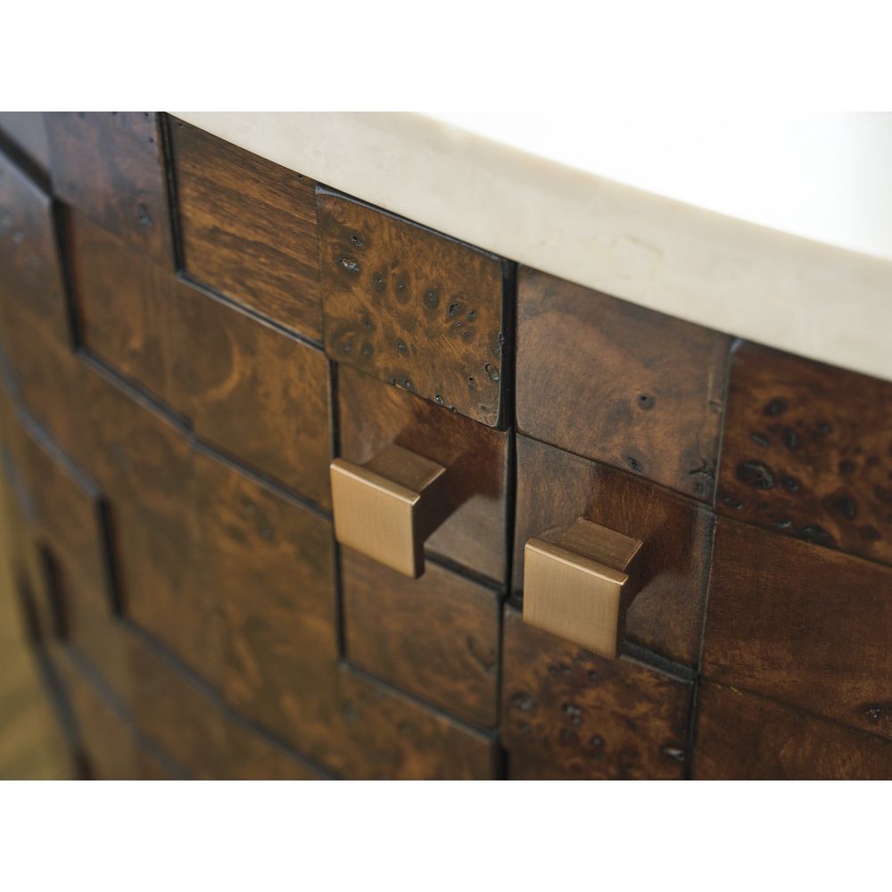 Marketing Copy: Designs in Rendezvous are best described as modern classics, or the place where contemporary meets traditional. Crafted from walnut veneers with elegant cathedral grain patterns, pieces are finished in a rich sable brown finish. Hardware is finished in rose gold and metal accents feature gold-burnished silver leaf. Select items showcase the natural beauty of Bulgari Beige marble tops. The result is a classic take on modern design, and a fresh view of luxury living.