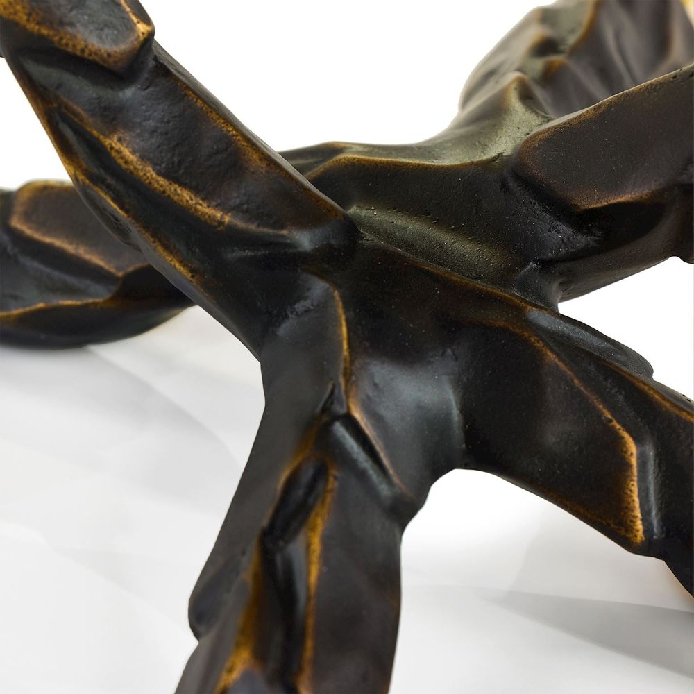 Moore Bronze Orb Table is a dimensional marvel, showcasing a plethora of visually striking textures. A stunning aluminum base in a Moore Bronze finish is paired with a rounded tabletop of polished black marble, infusing a space with touches of refinement and sophistication.