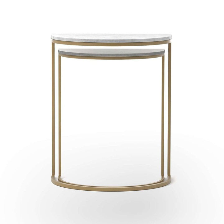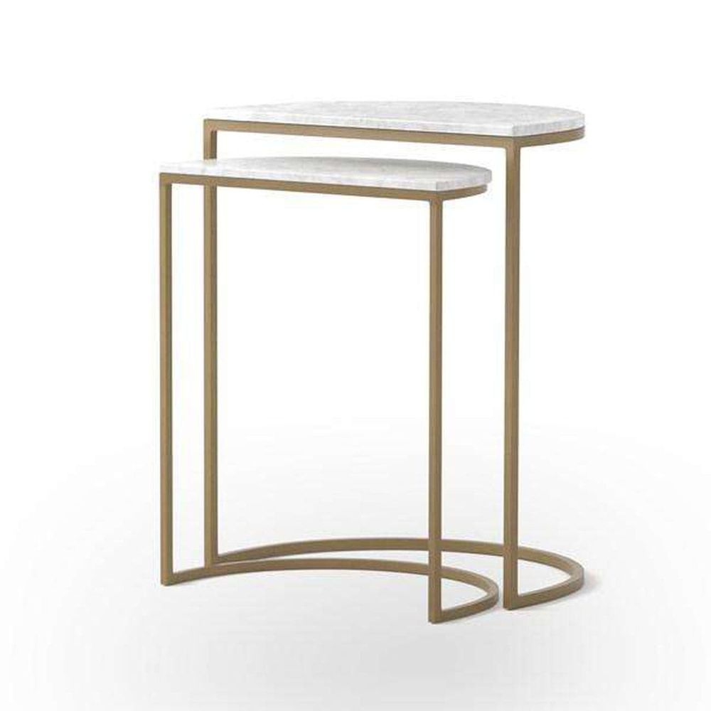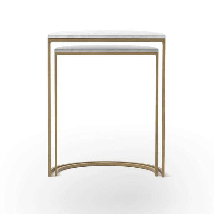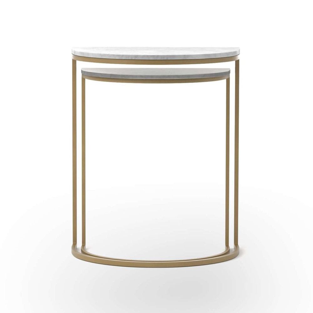 Style with a side of practicality. Slim brass-finished iron legs support semicircle tabletops of classic white marble. Nesting feature offers a handy extra surface when it's needed, tucking away with ease when it's not.