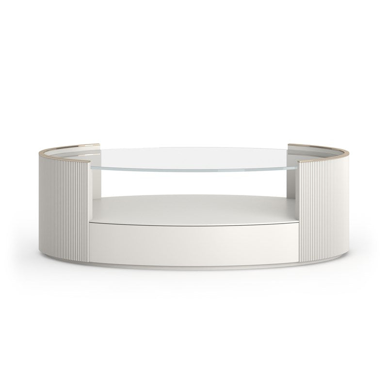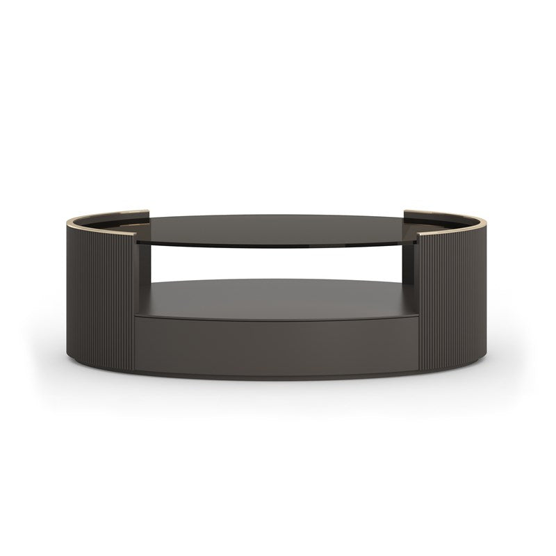 Gather around this oval cocktail table. This piece has a smoked bronze glass top and half-moon casework at the end of each oval that displays fluted detailing in Dark Chocolate. There is an open storage area and one drawer at the bottom with a fluted front, a bottom finger pull opener and soft-close hardware with an interior finished to match.
