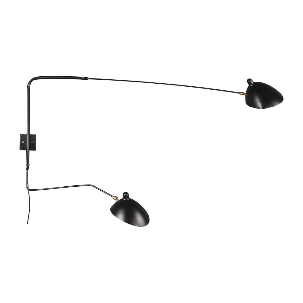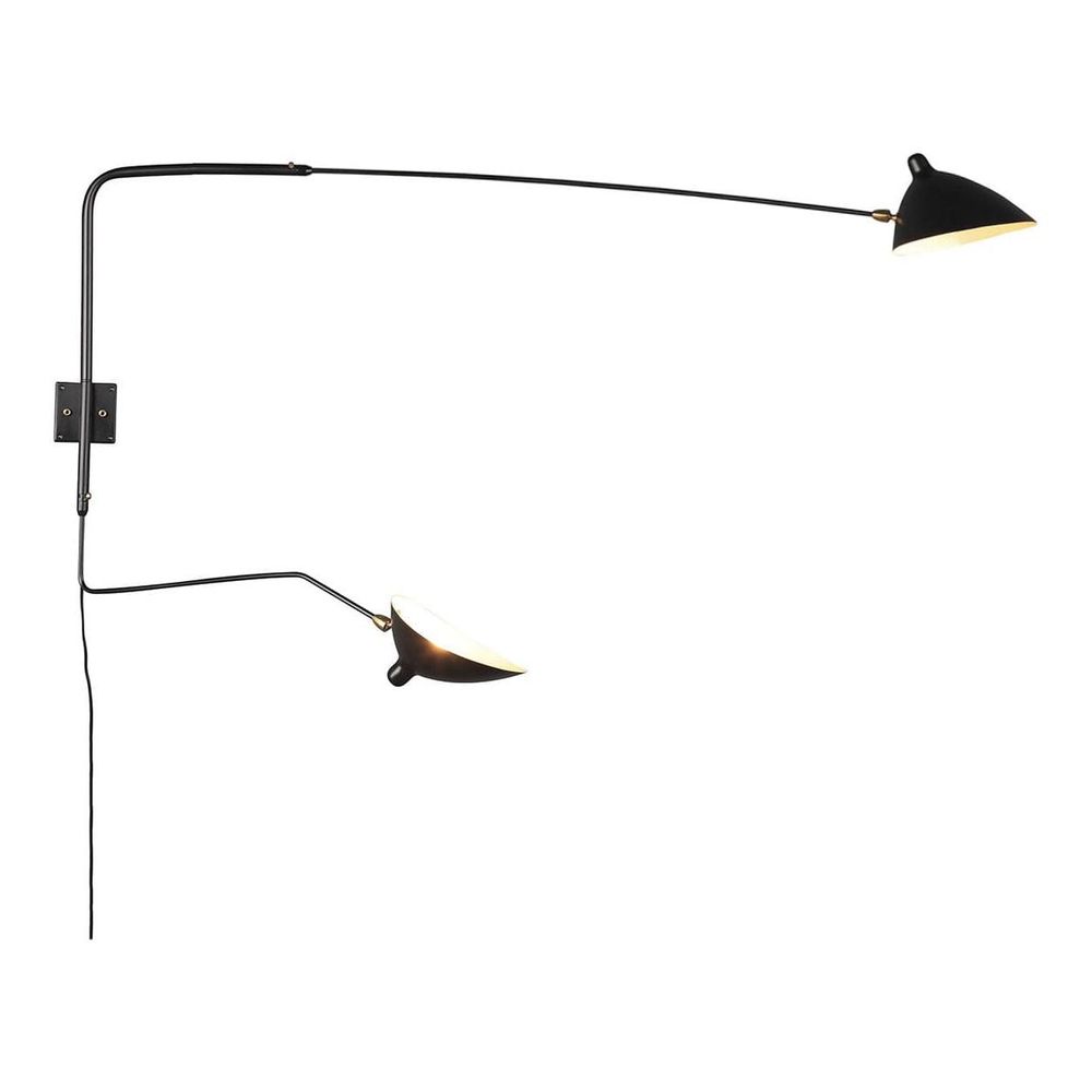 Originally designed by iconic French designer Serge Mouille, this wall sconce is constructed with two arms - one long and straight; one curved and shorter than the other. The slim arms are expertly crafted from cold rolled steel and powder coated a shiny black. This fully adjustable lamp allows you to alter the direction of the light to create the desired atmosphere in your room. Both arms can be moved from side to side. Each aluminum "chapeau" style shade can swivel to direct the light. This lamp uses E12 chandelier bulbs, which can be purchased at any home supply store.