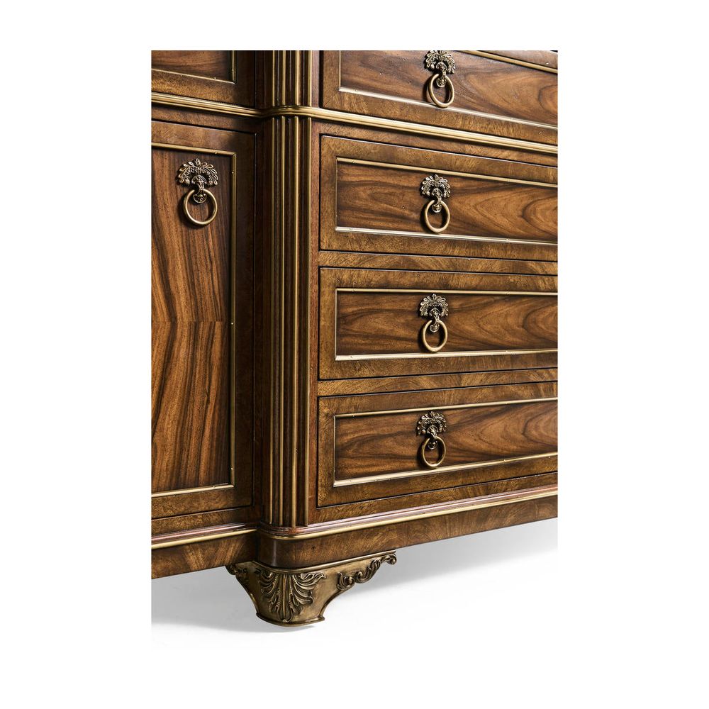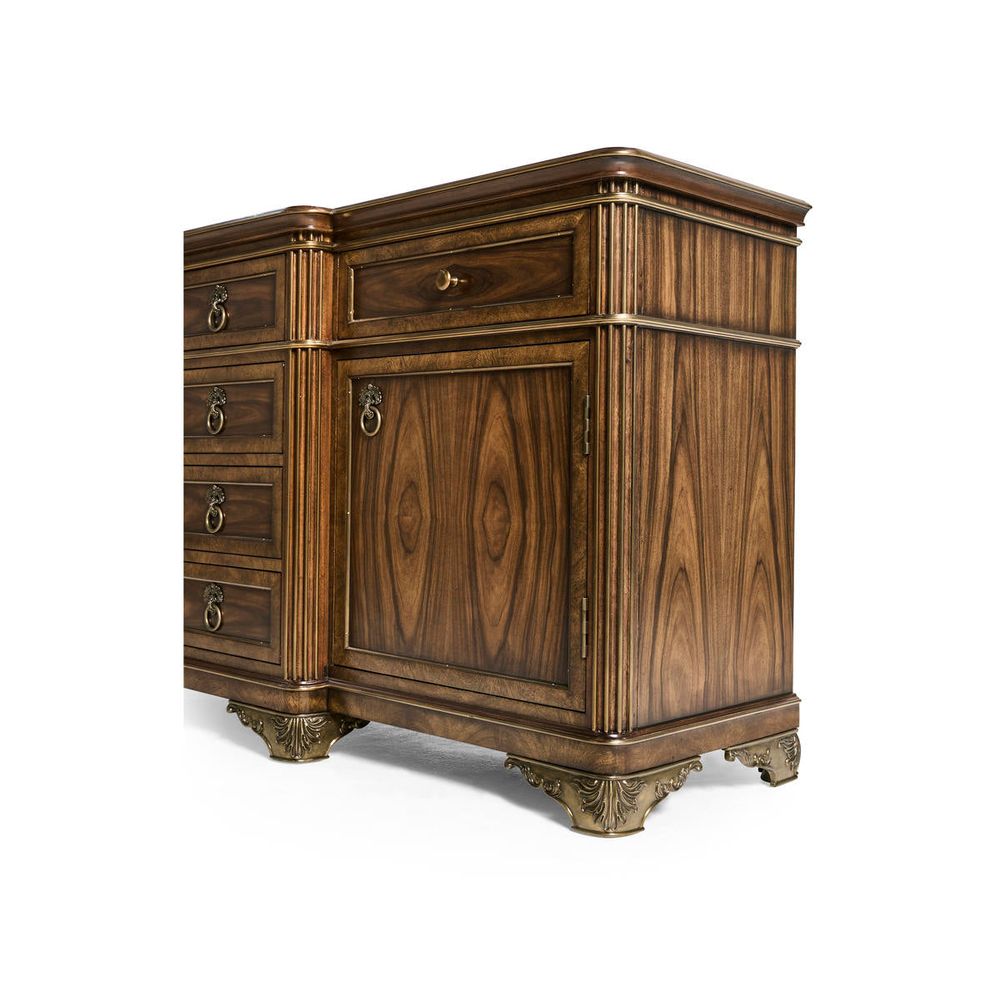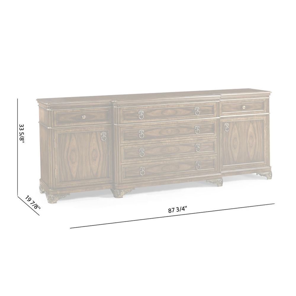 The Viceroy Sideboard showcases 19th-century traditional design, featuring a Santos Brown finish enriched with antique brass inlay for a refined and sophisticated look. Crafted from mahogany, cerejeira veneers, and santos rosewood crown veneers, this piece highlights expert antique wood finishing techniques that enhance its timeless appeal. Designed for both style and function, it offers six spacious drawers and two doors, each opening to reveal adjustable X-shaped shelves for customizable storage. The top middle drawer is accented with a single brass escutcheon, while cast brass hardware and bracket feet in an antique finish complete the elegant design. A perfect blend of form and function, the Viceroy Sideboard brings classic craftsmanship and practical storage to any traditional dining or living space.