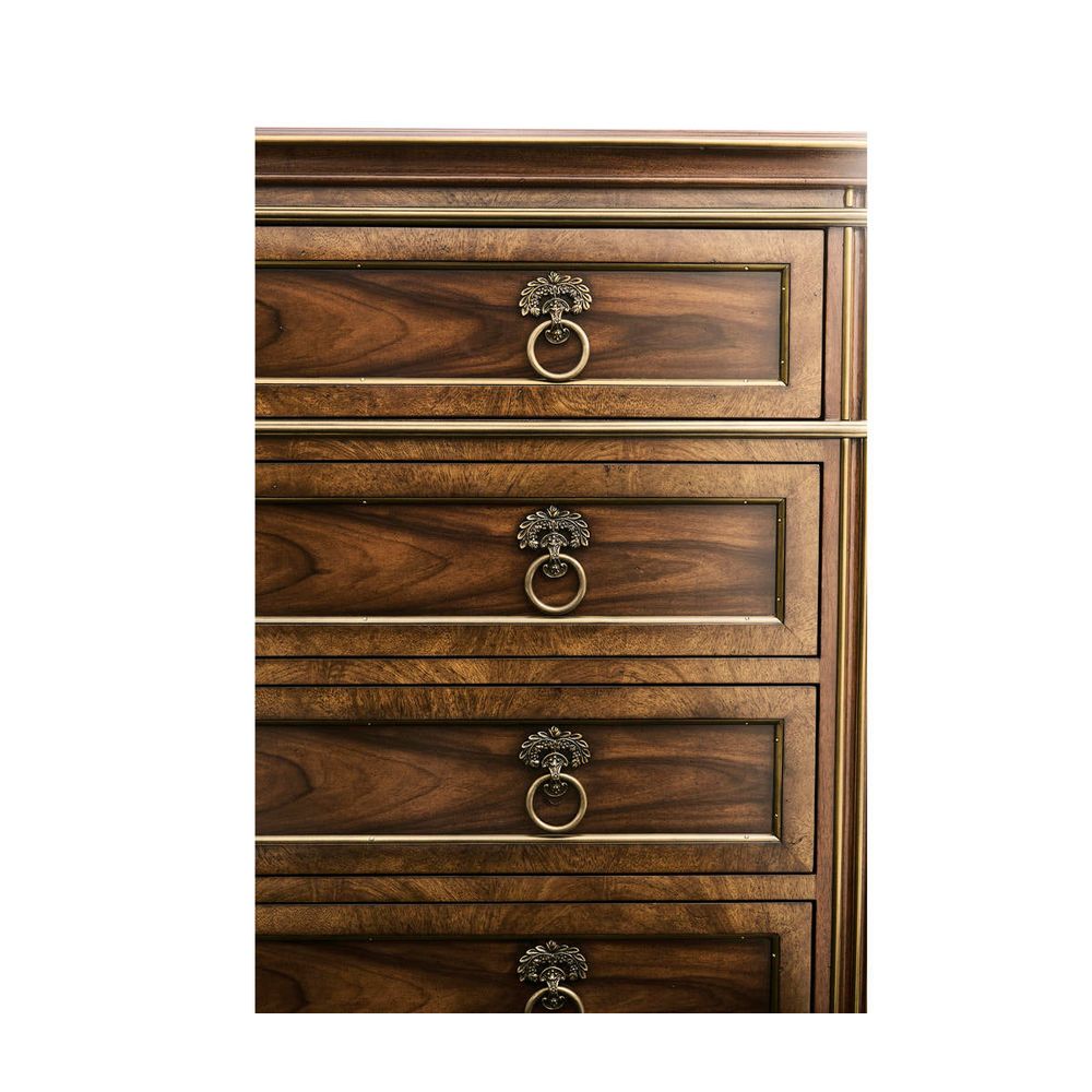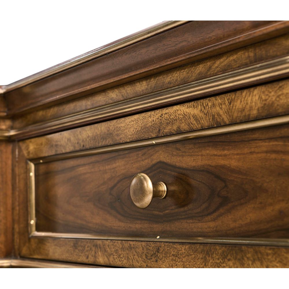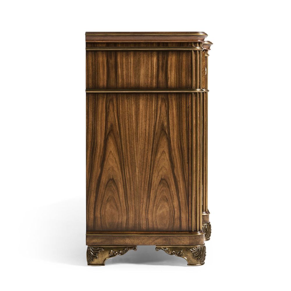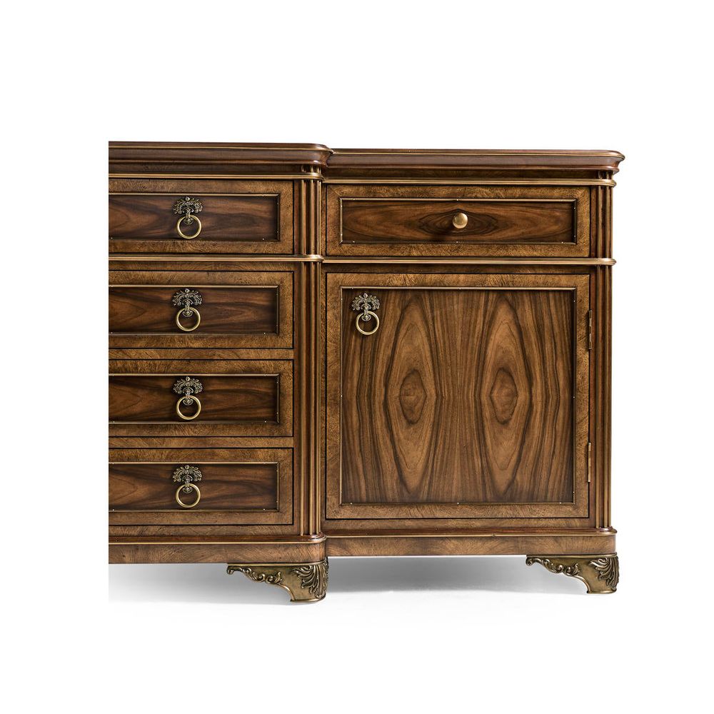 The Viceroy Sideboard showcases 19th-century traditional design, featuring a Santos Brown finish enriched with antique brass inlay for a refined and sophisticated look. Crafted from mahogany, cerejeira veneers, and santos rosewood crown veneers, this piece highlights expert antique wood finishing techniques that enhance its timeless appeal. Designed for both style and function, it offers six spacious drawers and two doors, each opening to reveal adjustable X-shaped shelves for customizable storage. The top middle drawer is accented with a single brass escutcheon, while cast brass hardware and bracket feet in an antique finish complete the elegant design. A perfect blend of form and function, the Viceroy Sideboard brings classic craftsmanship and practical storage to any traditional dining or living space.