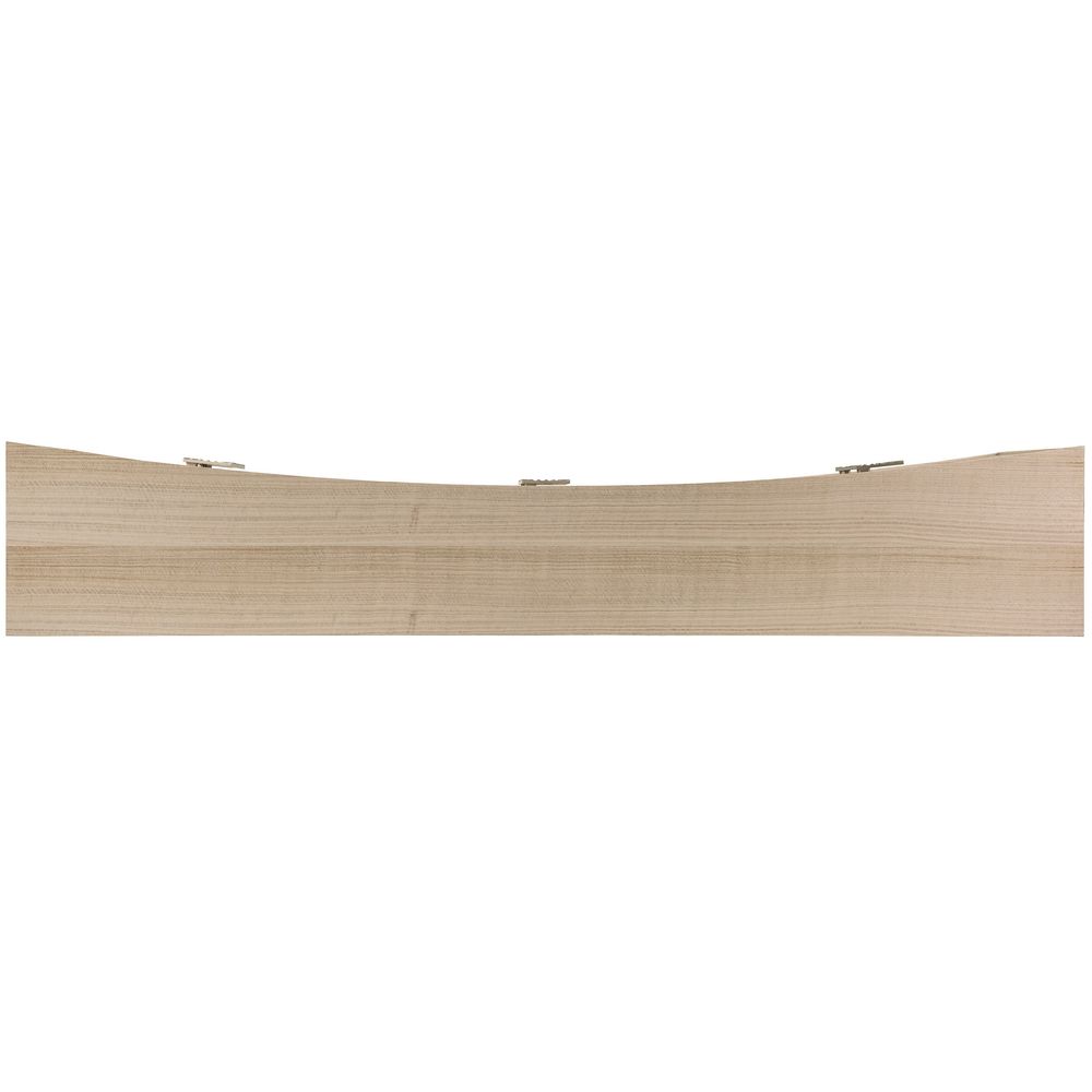 Feature 1: Dramatic contemporary design featuring concave shaping, with Eucalyptus veneers in a dove gray finish with contrasting tone borders, and custom brushed nickel hardware. Six doors, three drawers (left side facing drawer has removable felt pad, right side facing drawer is felt lined and divided), six adjustable shelves, ventilated removable back panel, and the partition is rounted for cord management.