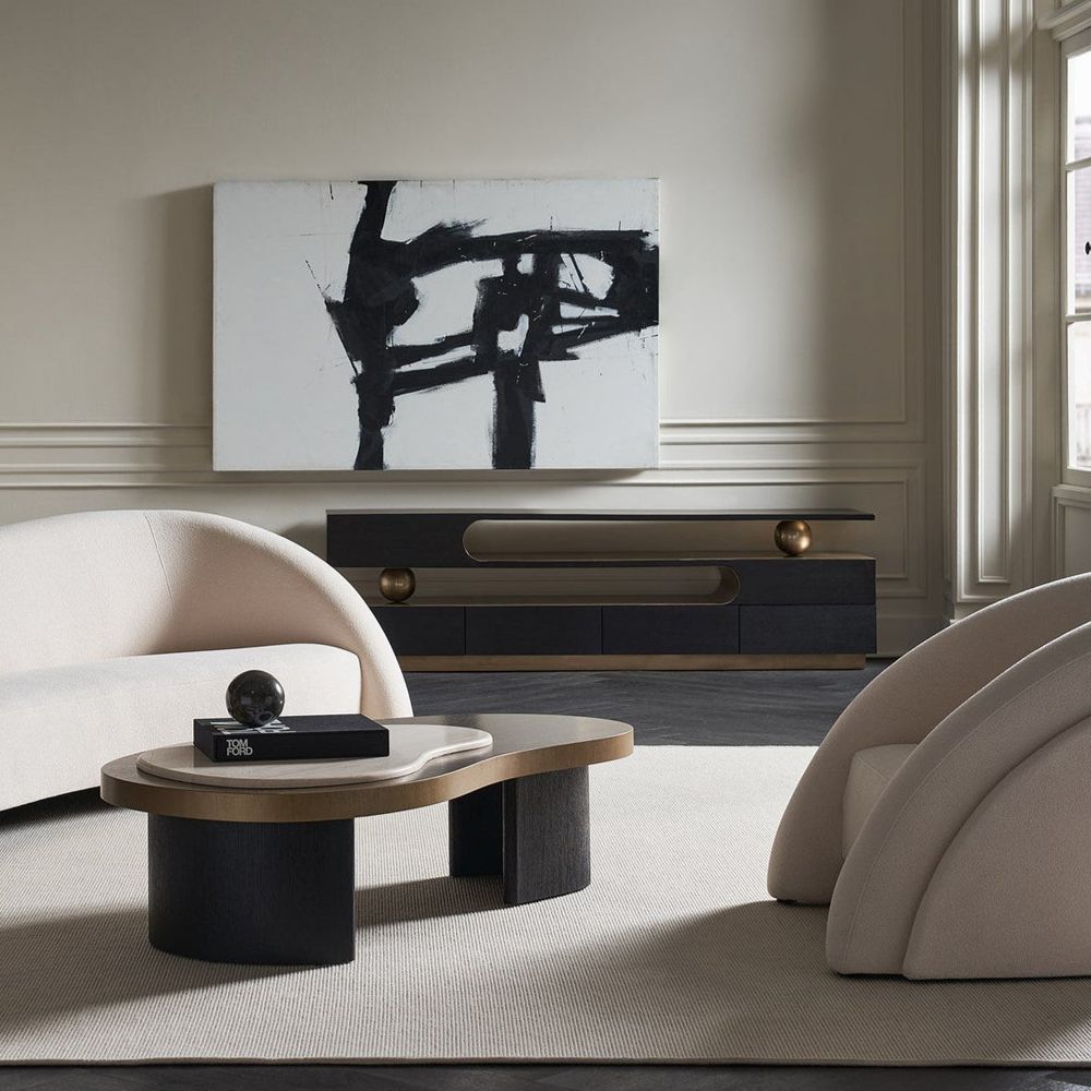A striking balance of form and function, this console makes clever use of space and shape to create a sense of movement and rhythm. Two metal spheres guide the eye along clean lines and curves, warmly articulated by a Lucent Bronze Metallic finish. Features four, soft-close drawers with bottom pulls and painted interiors for an added luxe touch. Style in a media room, or make a memorable first impression in a hall or entryway.