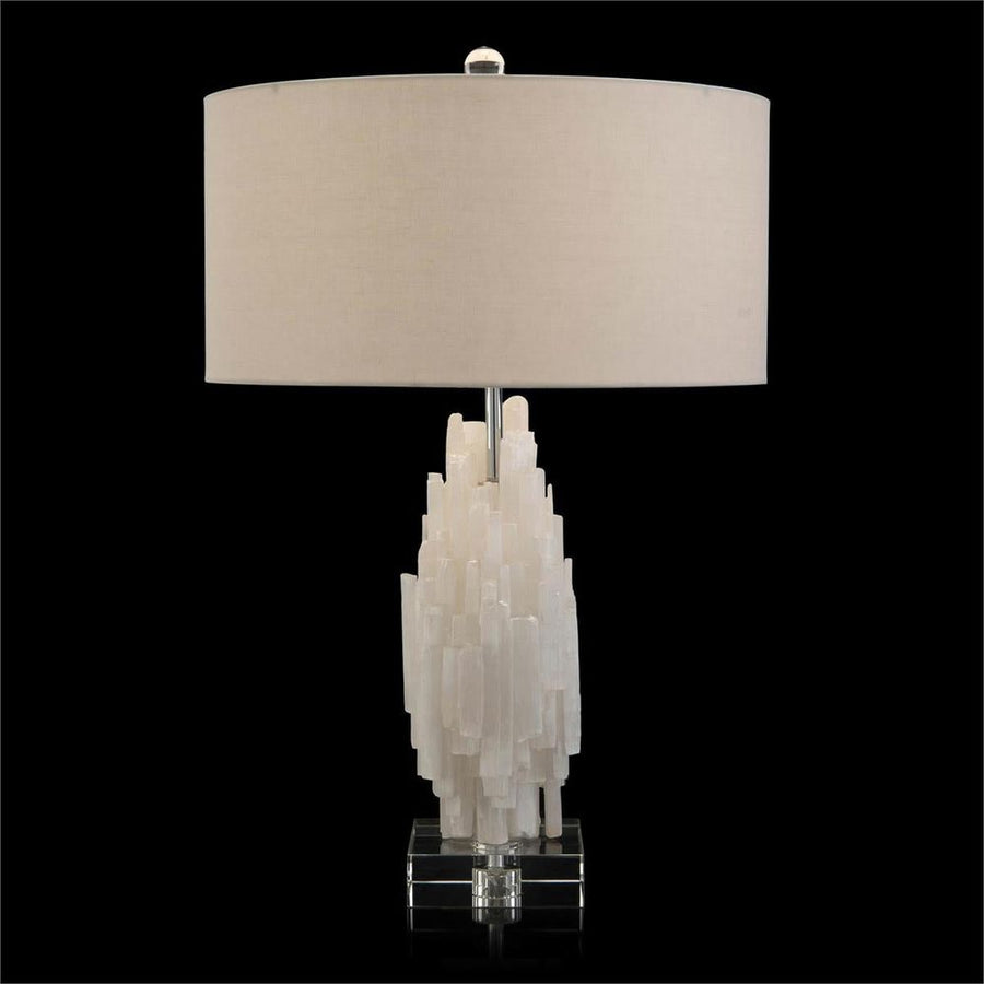 The Layered Selenite Table Lamp features a stunning display of natural selenite stone in a geometric formation. A clear crystal base and brass hardware in a Polished Nickel finish complete the look.