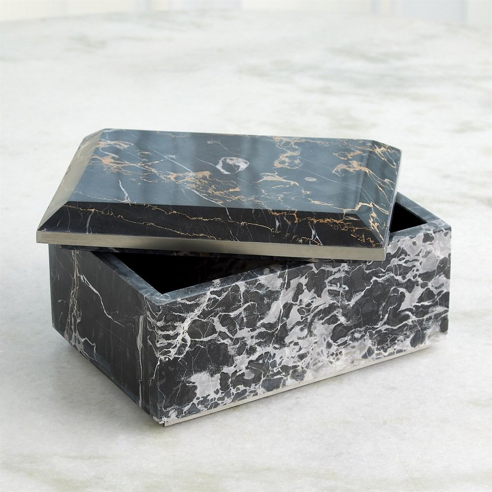 Description: The Golden Portoro Boxes, with their sleek and sophisticated design, feature Portoro marble sourced from the northern region of Italy. This exquisite and luxurious natural stone is renowned for its captivating black backdrop and stunning golden veining. Complemented by polished stainless steel accents, it radiates a modern and elevated aesthetic. As marble is a natural product, please be aware that there will always be variations in veining and color. This is to be expected and makes every marble product uniquely your own.