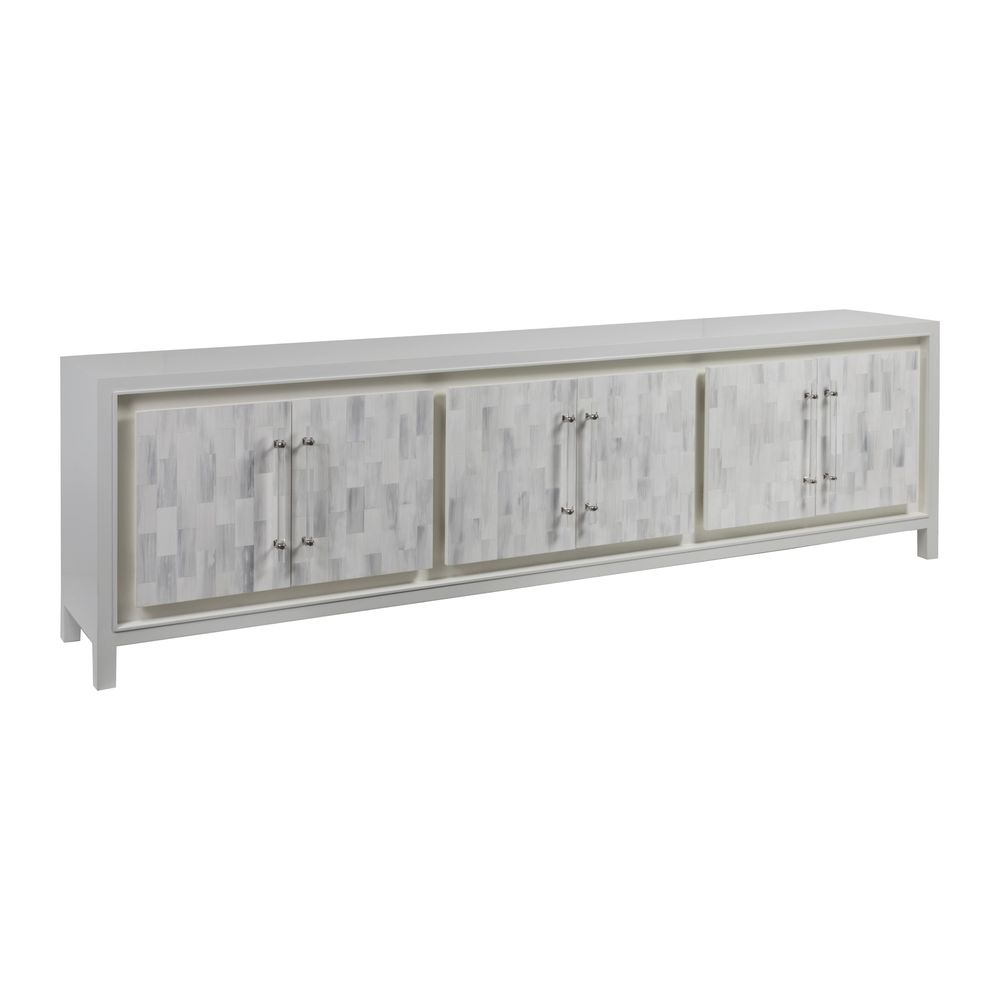 Feature 1: Faux horn motif hand-painted by artists on individual resin tiles in a light gray/white bone coloration with custom acrylic hardware and bright nickel finished clasps located on the six doors which hide six adjustable shelves and a ventilated back. Faux horn tiles will vary in appearance and coloration from piece to piece.