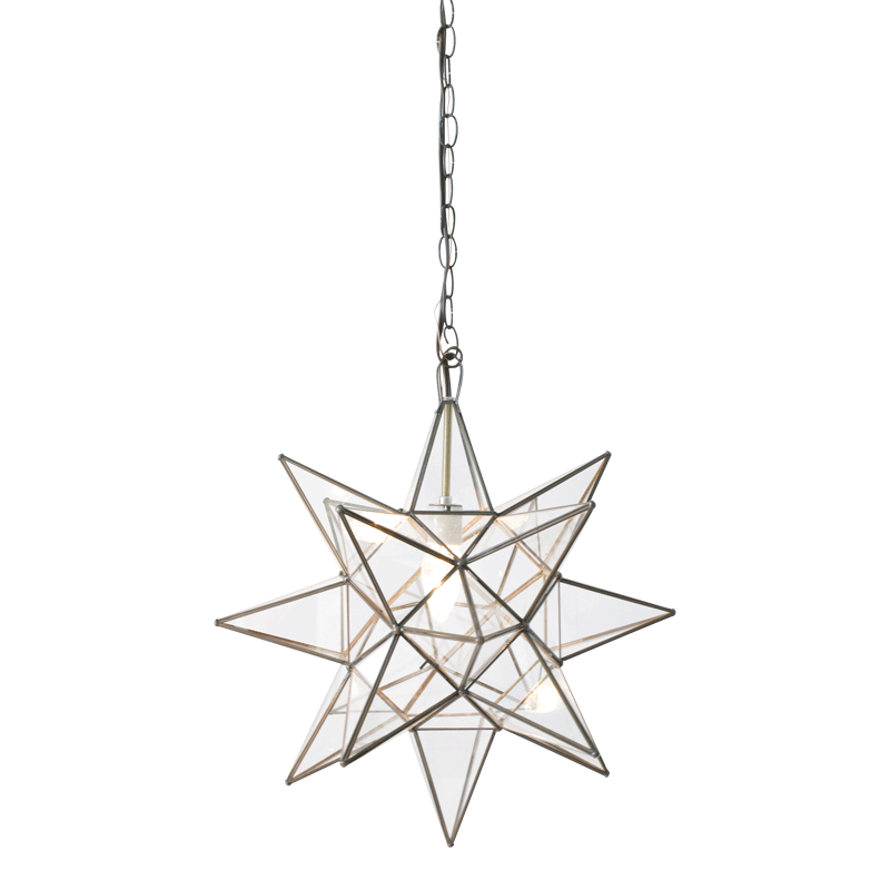 Description: This hand-crafted Moravian star pendant illuminates your home with whimsical sparkle. Oxidized metal finish and clear glass panes have classic appeal, and petite scaling makes it just the right touch for an intimate dining room, boudoir, or powder room. For added drama, group with our various size offerings to create and ethereal star scape. LARGE CLEAR STAR CHANDELIER ONE (1) 60W BULB 3' OF CHAIN & CANOPY INCLUDED. ADDITIONAL CHAIN MAY BE PURCHASED UPON REQUEST. Diameter: 20"