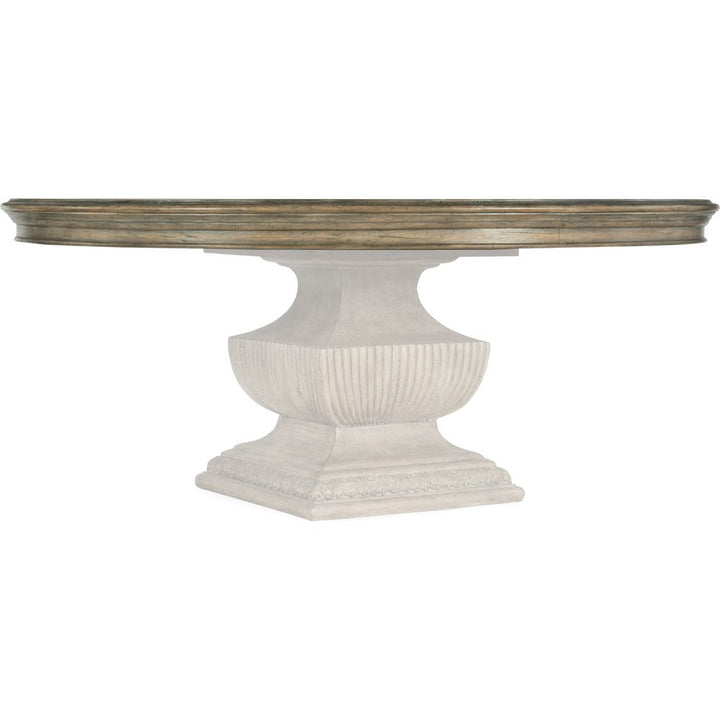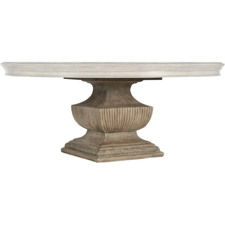 The stunning 60-inch Castella Round Dining Table brings together classic design elements, grand scale and a refined rustic finish with the look of natural wood bathed in sunshine to create a livable resort feeling for your dining setting. The classical urn-shaped base anchors the piece in old world charm, while the Antique Slate finish with a beautiful patina updates it for today's relaxed styles. Will seat up to six guests. Commanding attention in any space, the impressive scaling of the Castella Collection combines with classic design elements including scrolls, serpentine shapes, rope twist molding, acanthus leaf details and fleur-de-lis accents to create old world charm. Infused with emotion, the collection's exuberant scale and timeless motifs define its casually opulent style. Presented in an updated mid-tone brown finish with a beautiful patina, Castella offers Classic European design with an updated twist.