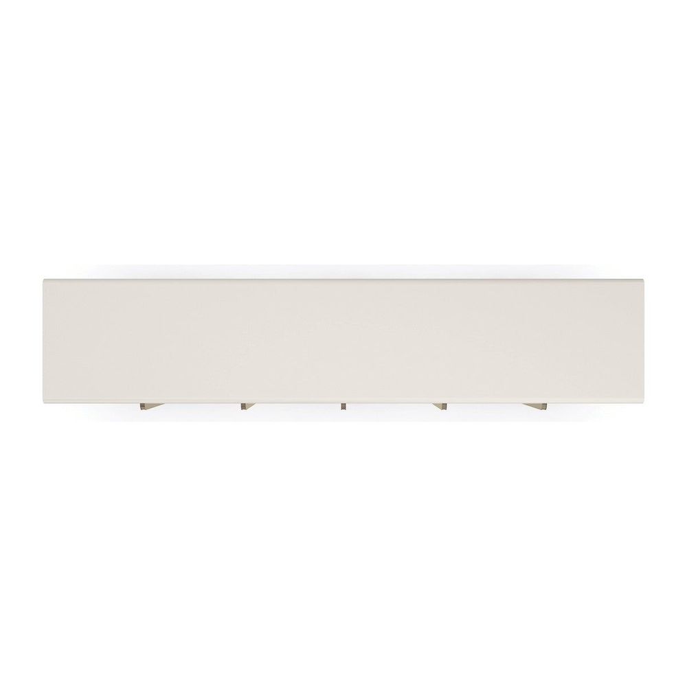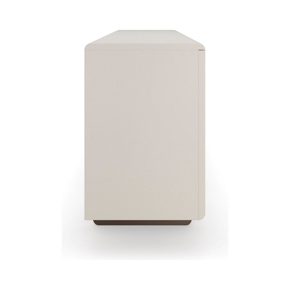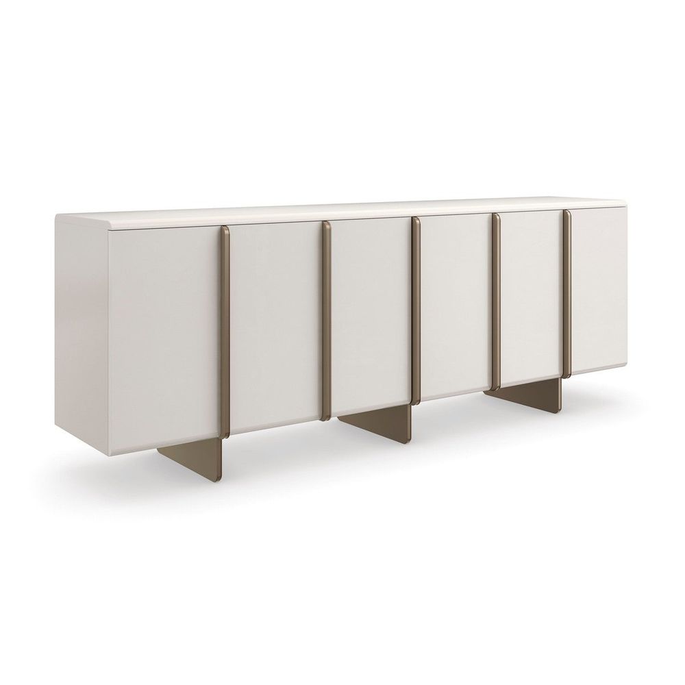 Features: Case finished in Almost White.Six soft close doors finished in Textured Adobe.Behind each outer door is one adjustable shelf.Behind center doors is open storage and center tray drawers with side guides.Metal legs and trim in Lucent Bronze Metallic.Interior finished in Almost White.