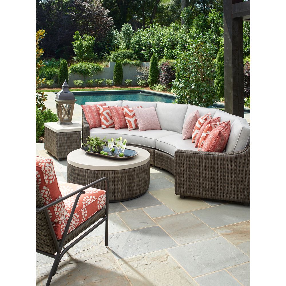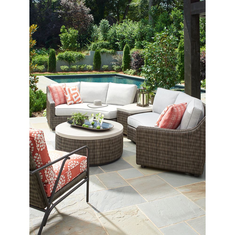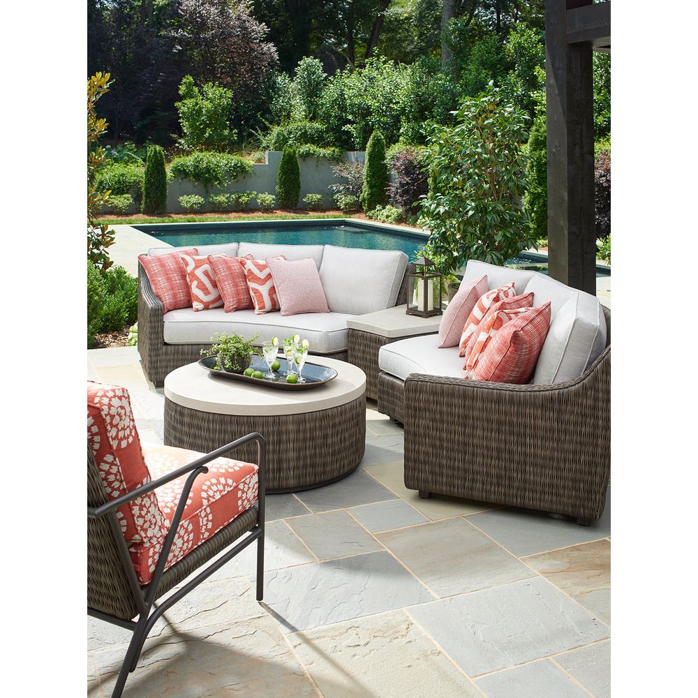 Marketing Copy: Cypress Point Ocean Terrace features a distinctive V-pattern of all-weather woven wicker, aluminum frames in a custom aged iron finish and contemporary Weatherstone tops that emulate honed limestone. Woven wicker is finished in a rich driftwood gray coloration, offering a sophisticated neutral palette as a foundation for layering striking correlations of performance fabrics. Upholstery configurations offer the flexibility to arrange curved, straight or circular seating to accommodate even the largest of outdoor living spaces.
