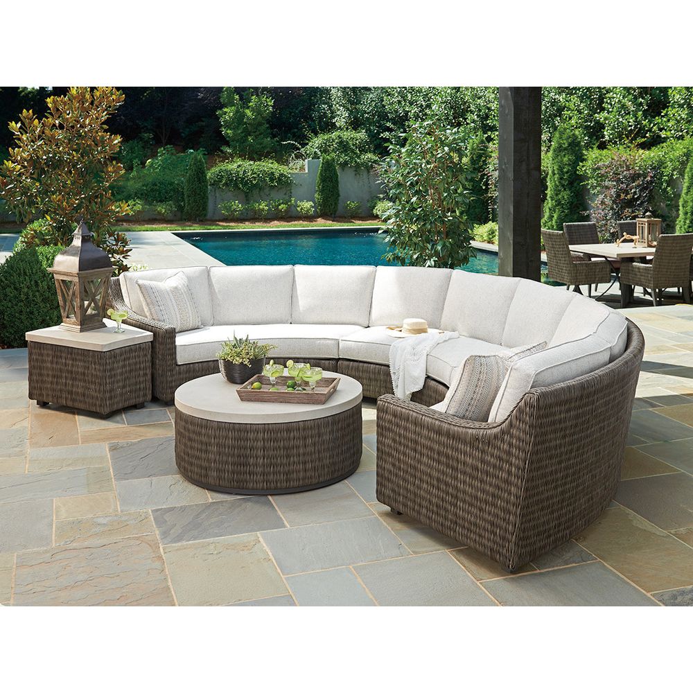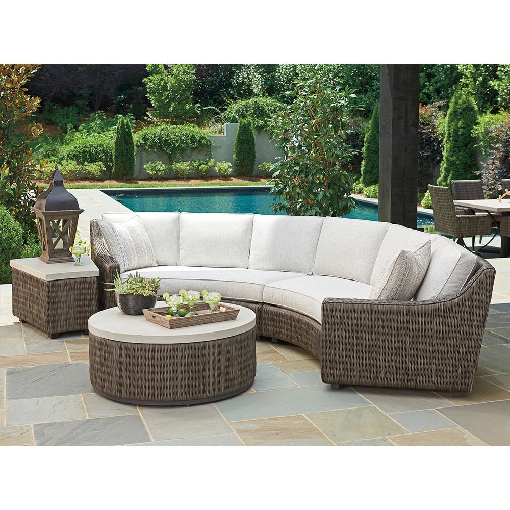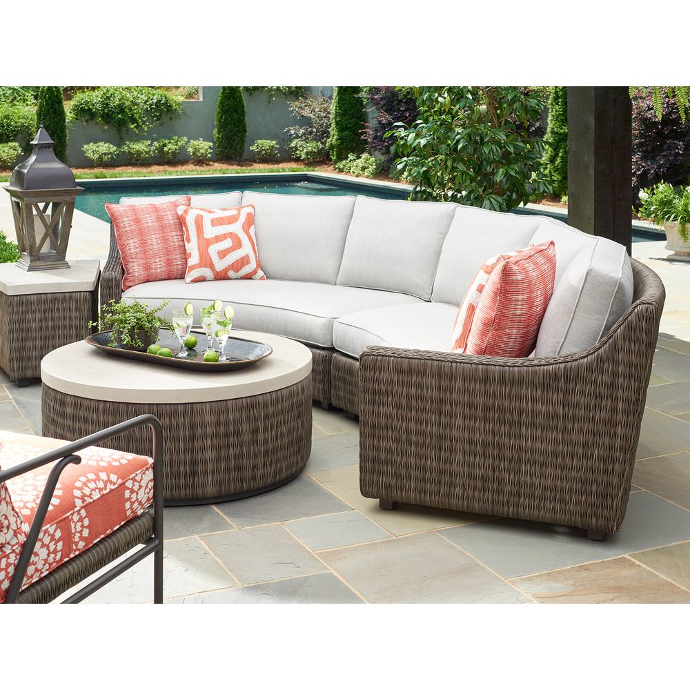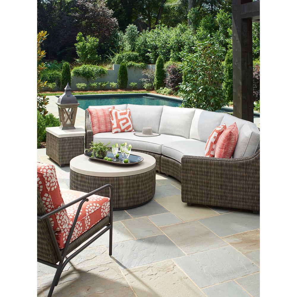 Marketing Copy: Cypress Point Ocean Terrace features a distinctive V-pattern of all-weather woven wicker, aluminum frames in a custom aged iron finish and contemporary Weatherstone tops that emulate honed limestone. Woven wicker is finished in a rich driftwood gray coloration, offering a sophisticated neutral palette as a foundation for layering striking correlations of performance fabrics. Upholstery configurations offer the flexibility to arrange curved, straight or circular seating to accommodate even the largest of outdoor living spaces.