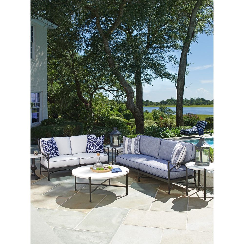 Feature 1: Pavlova occasional tables feature clean architectural lines with a cross-stretcher at the base and contemporary flared legs. Frames have a sophisticated, lightly textured graphic finish, and durable all-weather tops emulate the look and feel of honed natural limestone, in a soft ivory coloration, for a classic look.