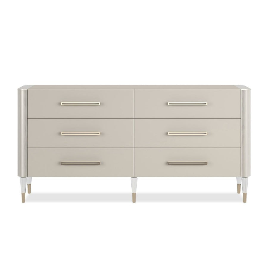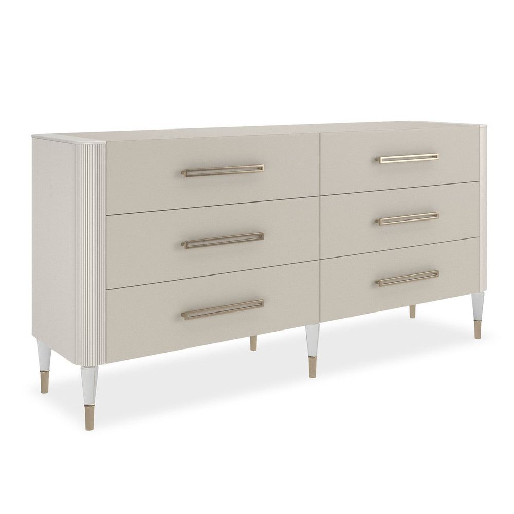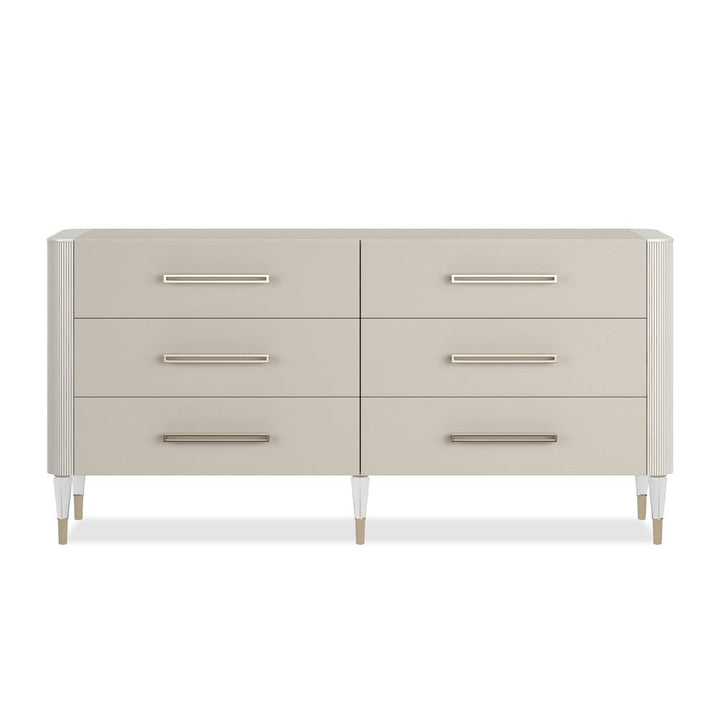 The love story with this six-drawer chest begins with an inspired mix of materials. Its reeded side panels are finished in soft Matte Pearl paint. The top and fronts of the drawers are covered in pearlescent vinyl. Six drawers have elongated, jewelry-inspired Whisper of Gold pulls. Conical acrylic feet with Whisper of Gold metal ferrules enhance the feminine nature of this chest.