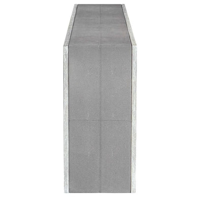 With modern elements, this transitional console features stitched panels of light gray faux shagreen, paired with a contrasting wood finish in a aged white with gray distressed details.