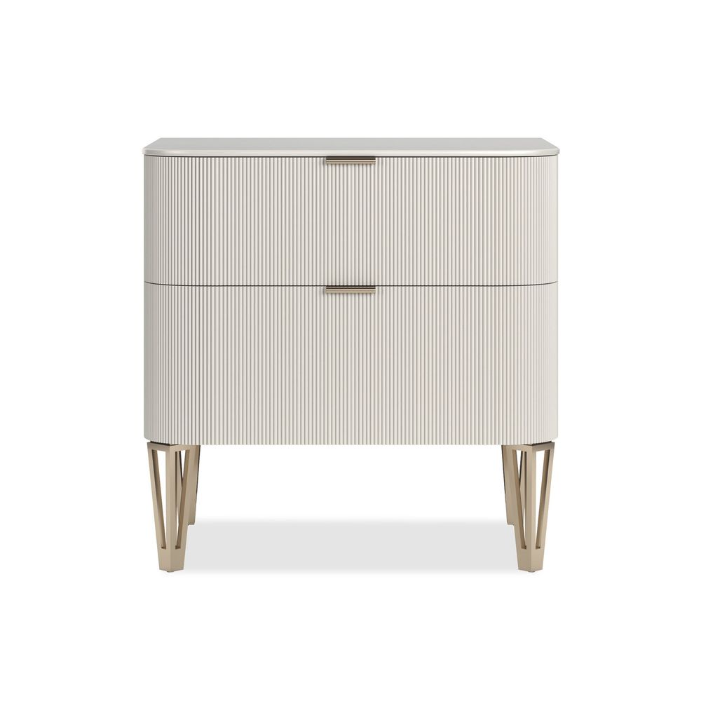 Features: Case finished in Matte Pearl.Two drawers with reeded fronts and soft close undermount guides.Metal feet in Whisper of Gold.Interior finish paint to match.
