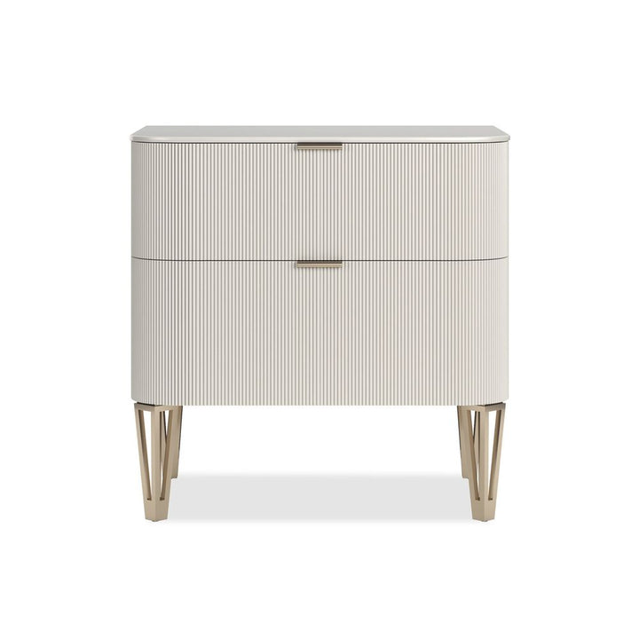 This is a more petite version of our True Love nightstand. A lustrous palette of Matte Pearl and Whisper of Gold highlights its rounded silhouette and fluted surfaces. Like the perfect earrings complete an outfit, this nightstand's glimmering tapered feet in Whisper of Gold add an unforgettable finishing touch. This piece has two under-mount drawers.