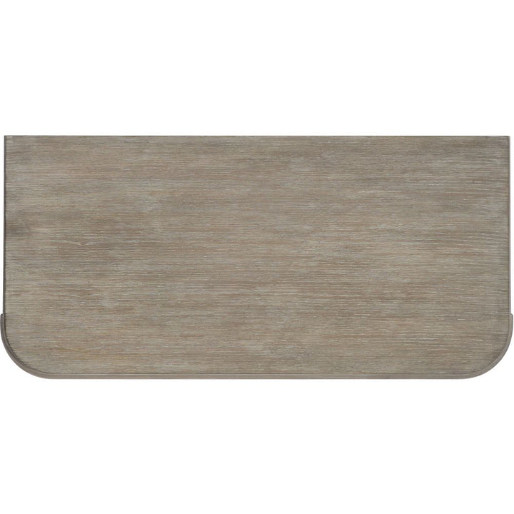 Soft, rounded forms combine with sand-blasted greige and antique white finishes to create an inviting transitional boutique collection in Affinity. The main finish for the 20-piece collection of bedroom, dining room, occasional, accents and home entertainment is a wire-brushed greige (gray/beige) on quartered white oak. Pewter and antique white hardware and soft linen fabrics add intrigue.