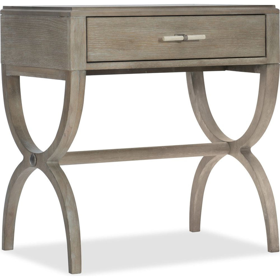 Description: Sleek and sophisticated, the Affinity Leg Nightstand blends a simple one-drawer top with a pewter and antique white bar pull with an intriguing base combining rounded X-motif legs and a center stretcher. Crafted of Oak Veneers, the nightstand is finished in a wire-brushed greige and antique white finish.