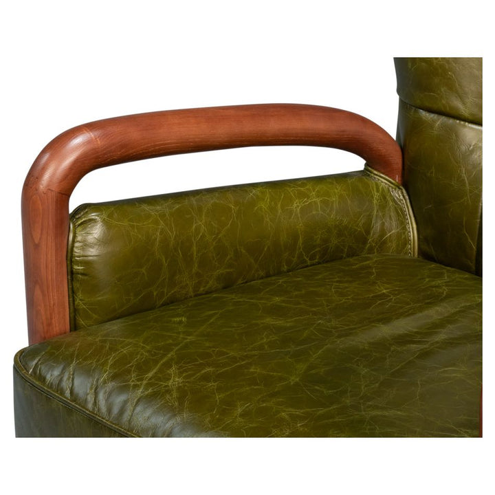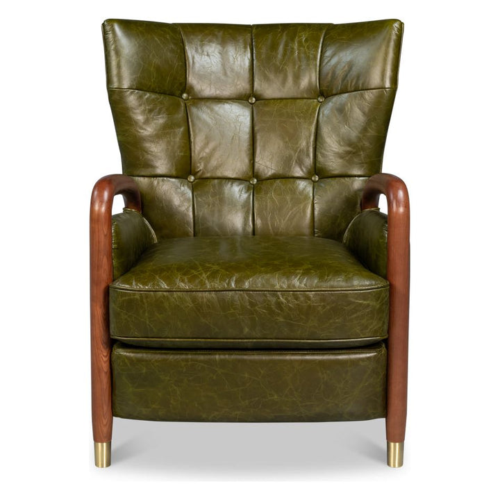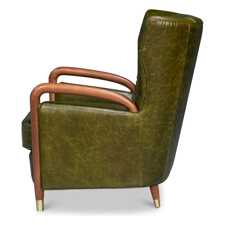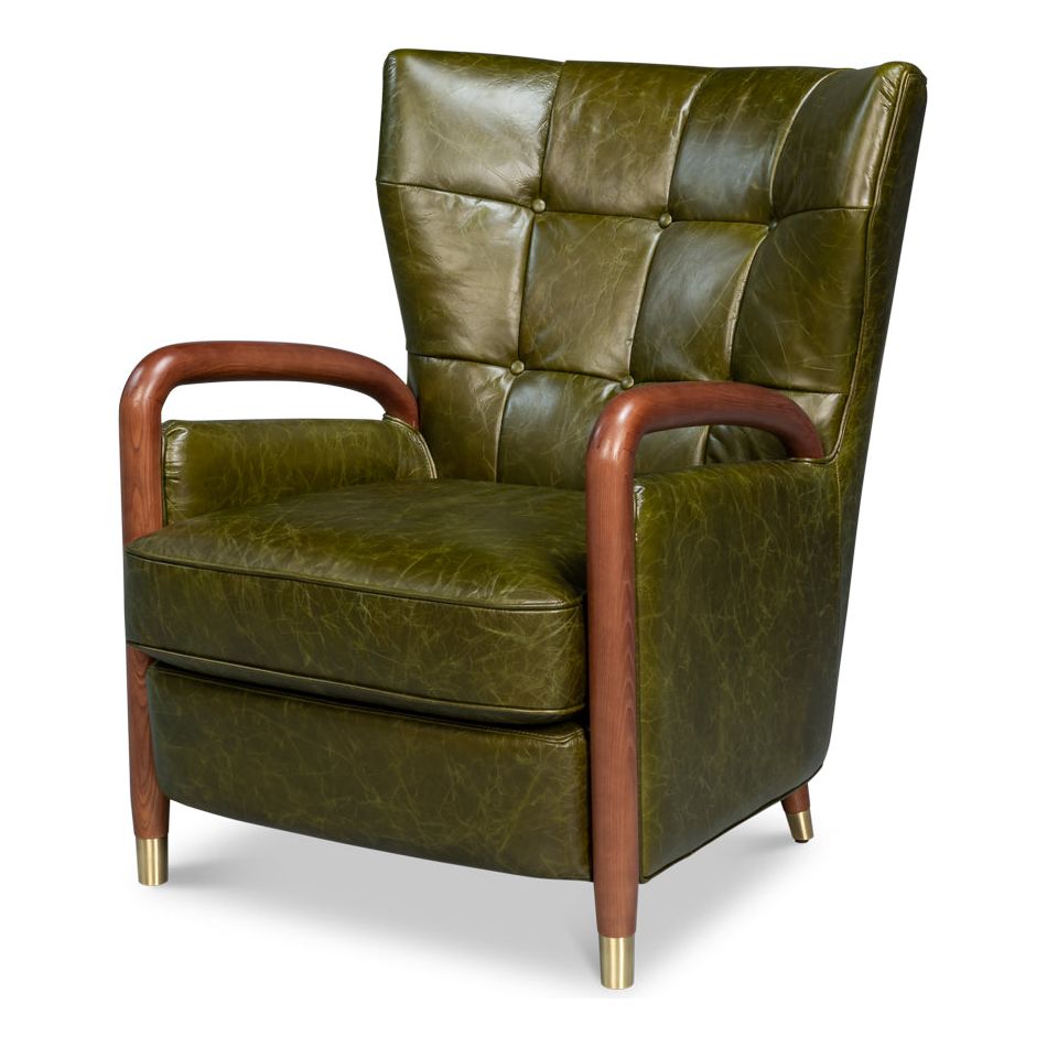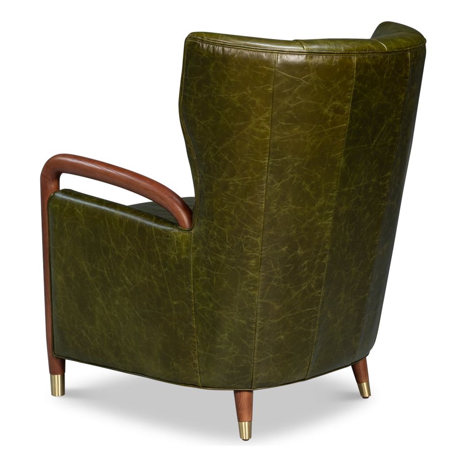 Description: Exuding refined mid-century elegance, this winged barrel-back chair is upholstered in luxurious top-grain leather with shallow tufting for a timeless appeal. Exposed wood arms and brass-tipped legs add a striking contrast, blending sophistication with modern craftsmanship.
