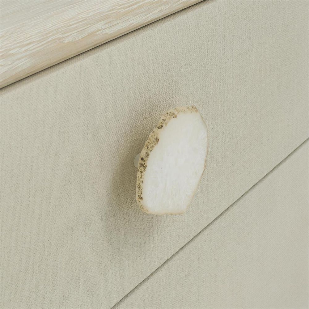 The Aurora Nightstand showcases a classic, distinguished look that lends an enchanting sense of gravitas to an interior space. Crafted from oak wood in a white washed finish, the piece features two drawers adorned in linen fabric with handles of white agate. With smoothed edges, slender wooden legs, and a delicate ivory hue, the piece possesses a subdued look and feel that translates beautifully to a variety of design styles.