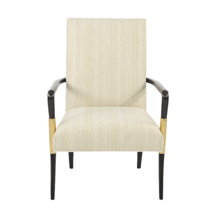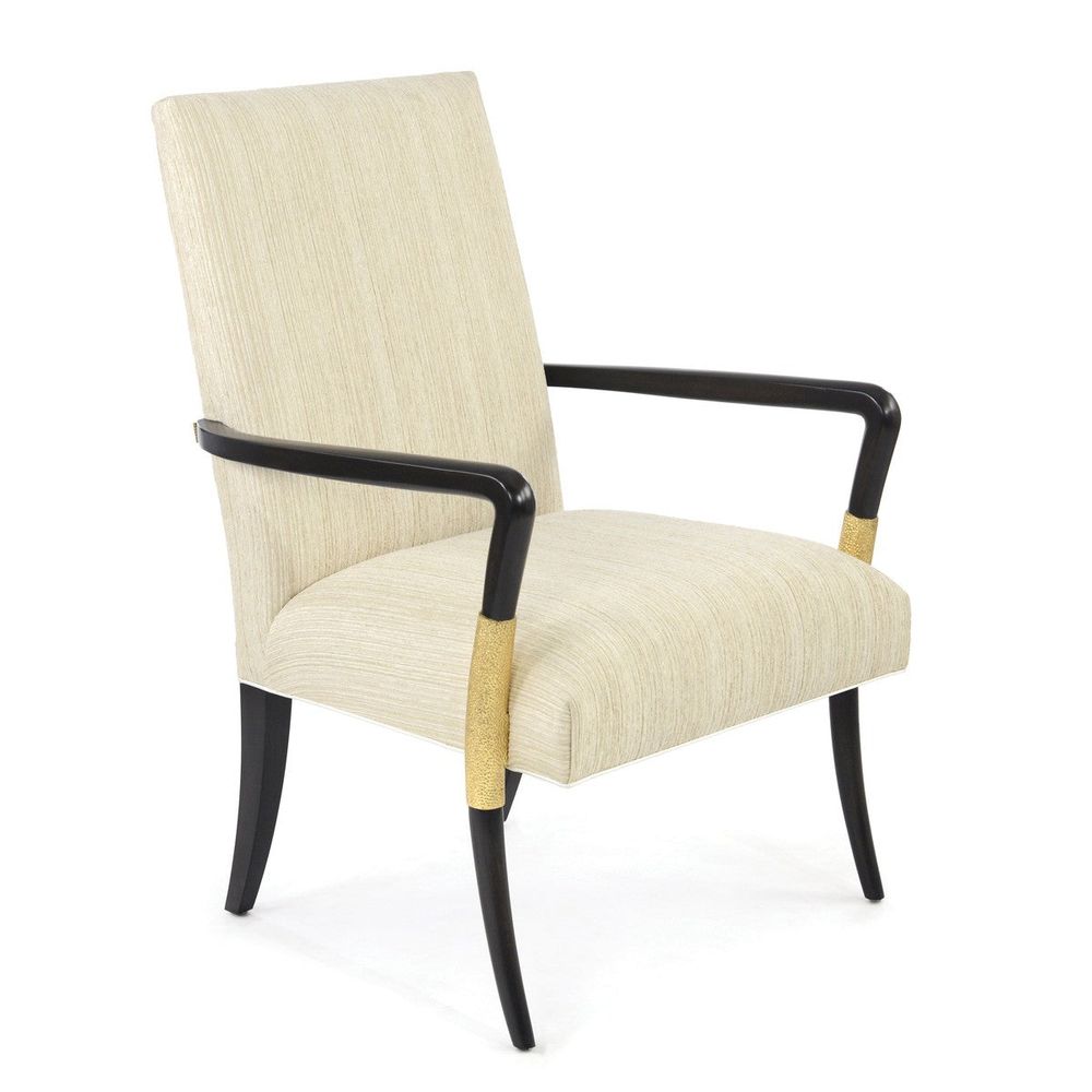Description: 40.5"H X 27"W X 28.5"D Alcott Armchair shown in V228G Sorano Brown (with Gold) finish and 2179 fabric. An armchair has a solid wood frame in sorano brown with carved decoration on the legs in gold leaf. The upholstered seat and back are in a neutral fabric, with a decorative polished brass band to the rear finished with a white crystal geode.