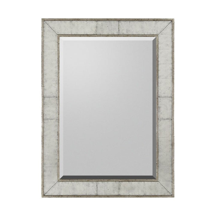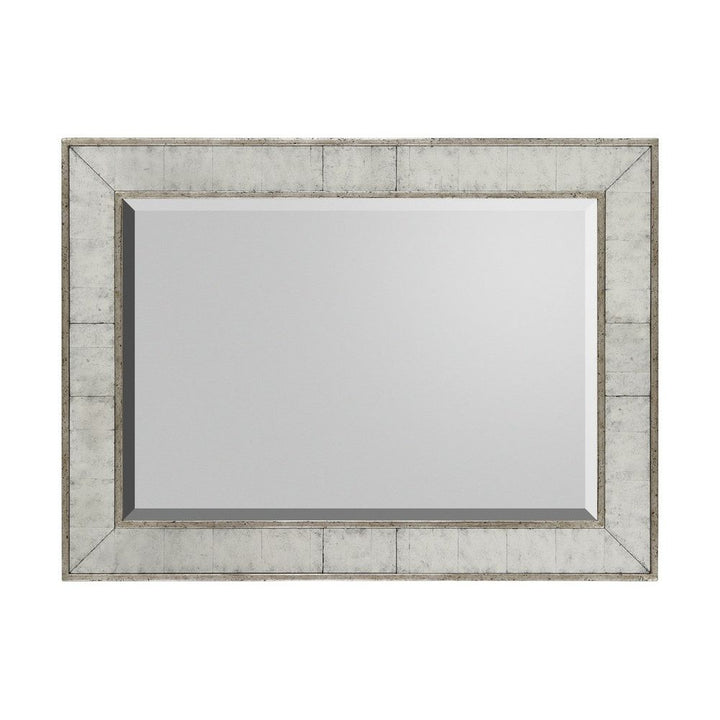 Description: Silver frame beveled mirror surrounded by hand applied eglomise