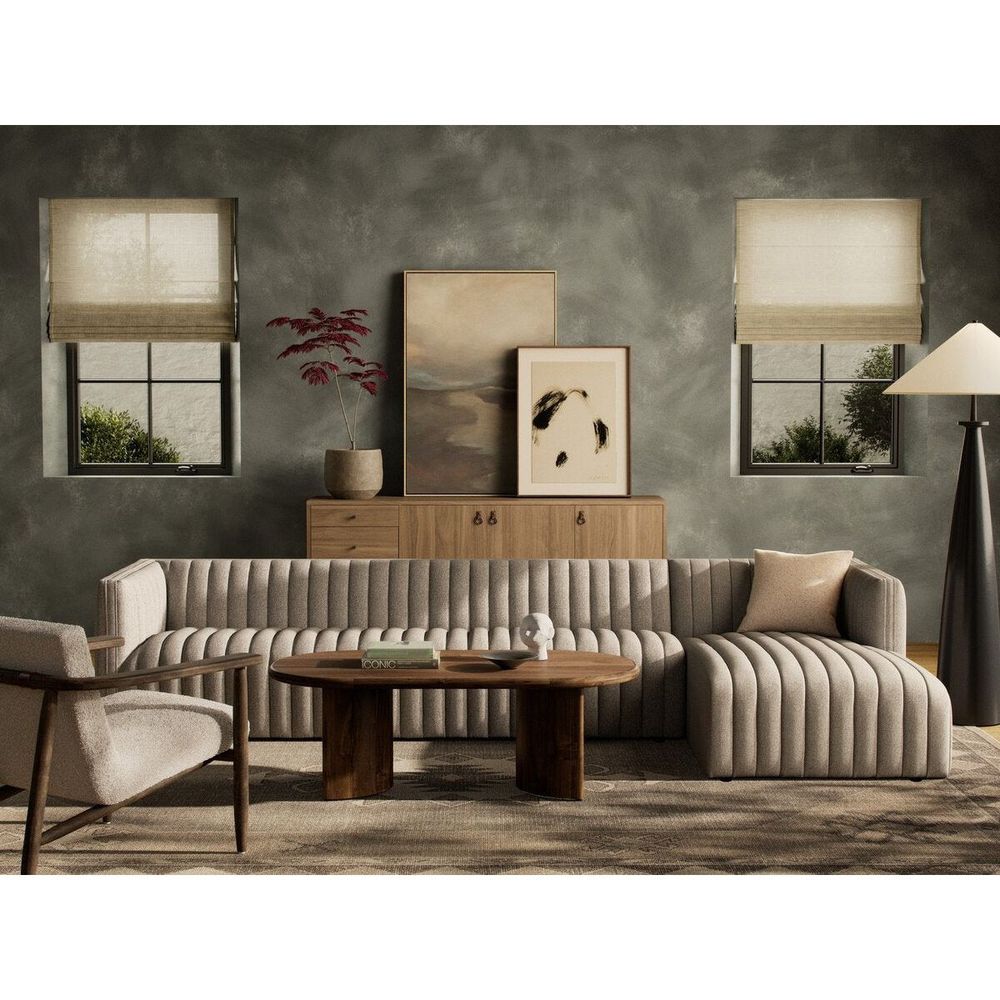 A dramatically channeled sofa with textural grey upholstery offers a crisp, clean look inspired by modern menswear. Two-piece sectional with right arm-facing chaise, sized for larger spaces.