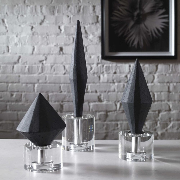 Elegant white diamonds are crafted from ivory man-made stone that accurately replicates the look of Thassos marble atop crystal bases. Sizes: S-5x7x5, M-4x10x4, L-4x14x4