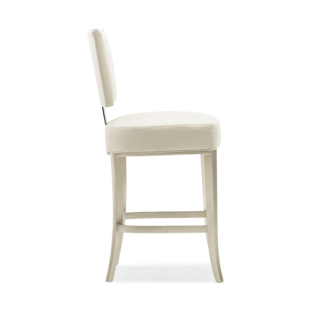 Update the look of your dining area with the pure sophistication of this chic counter stool and you'll never want to be anywhere else. Its contemporized shape is fully upholstered in a soft neutral and features a floating square back connected by a metal support finished in shimmering Lightly Brushed Chrome. An ideal addition to any counter-height island or table it's framed in a Soft Silver Paint finish that lets its elegant character reflect the light from every vantage.