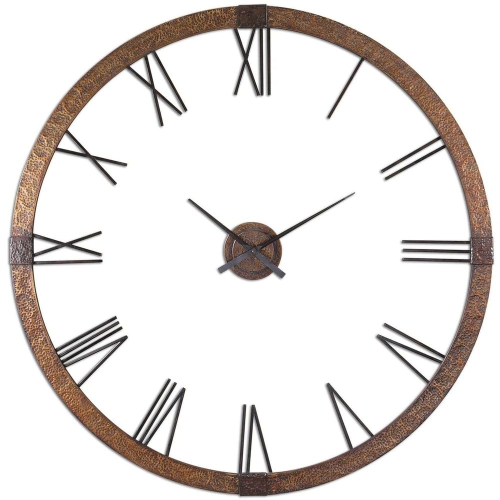 Description: This Oversized Wall Clock Features Hammered Copper Sheeting With A Light Gray Wash And Aged Black Details. Center Hands Movement Is Separate From The Outer Frame. Quartz Movement Ensures Accurate Timekeeping. Requires One "C" Battery. Some Assembly Required.
