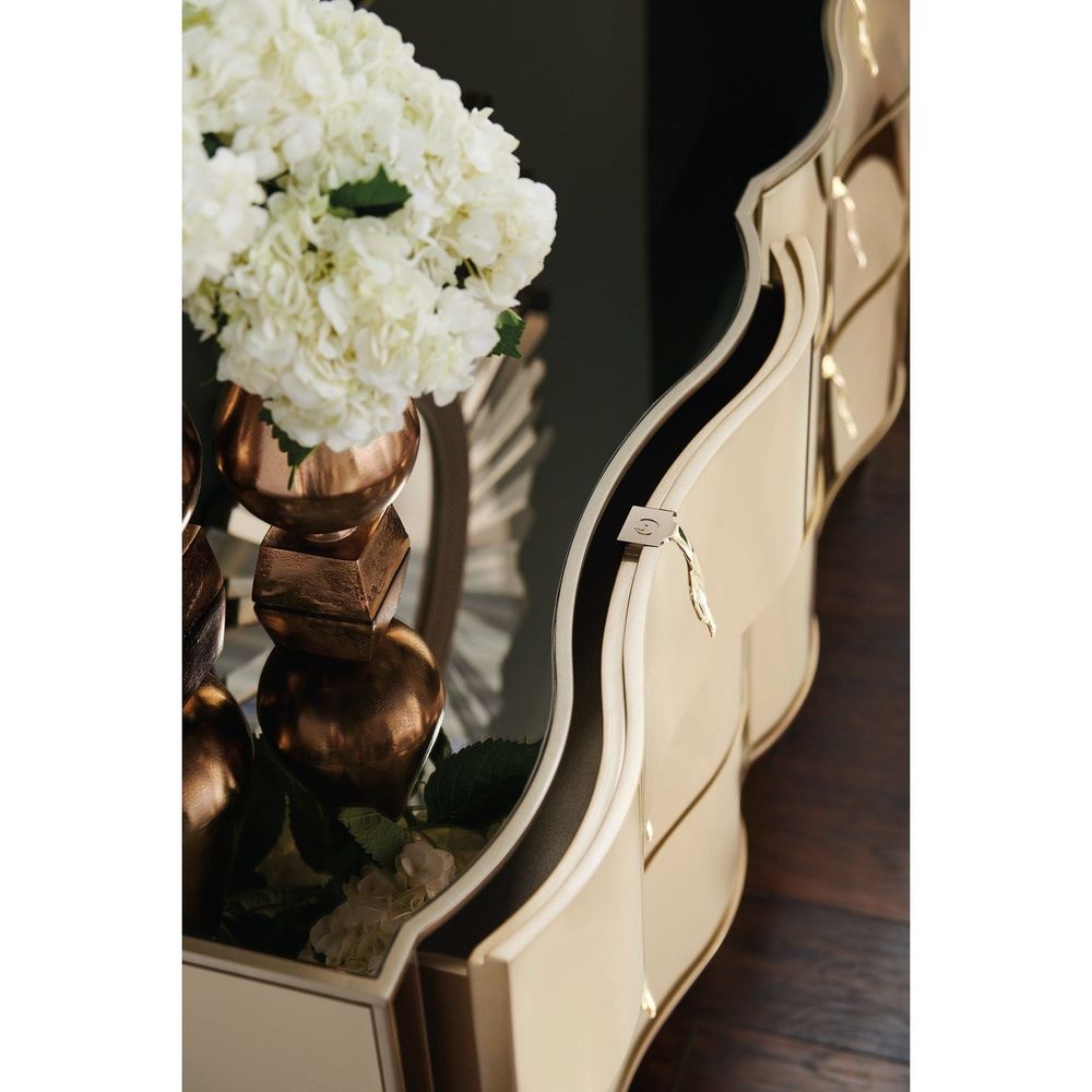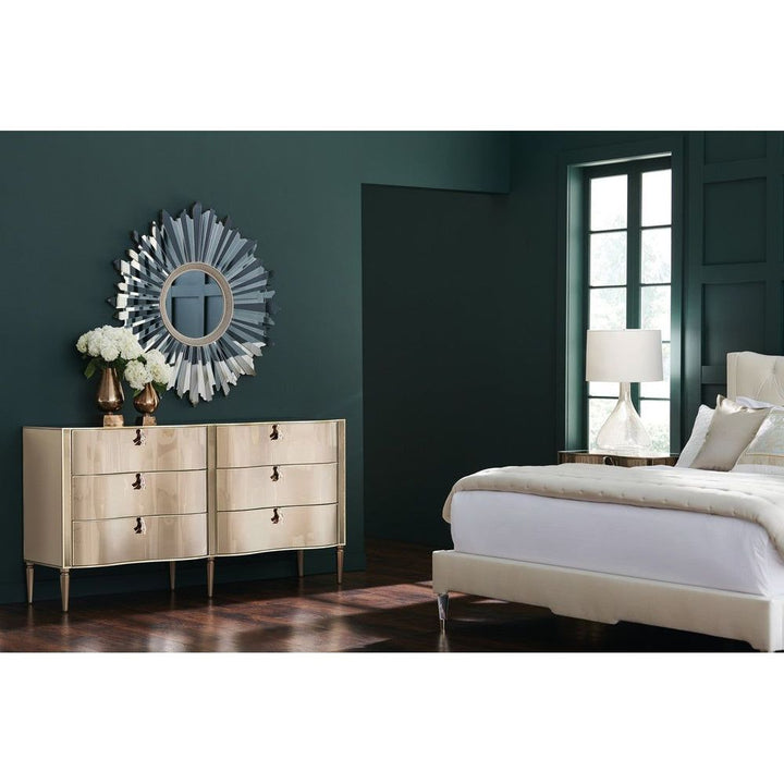 With shapely curves and a rich mix of materials, it's no wonder this dresser is a designer favorite. Its six spacious drawers ensure you have a place to store everything while its fresh design combines classic and modern influences. Wearing a Golden Shimmer finish, it boasts a bronze mirrored top, end panels and post overlays. Dazzling jewelry-like drawer pulls and shaped legs add an element of glamour to complete the look of this unexpected beauty.