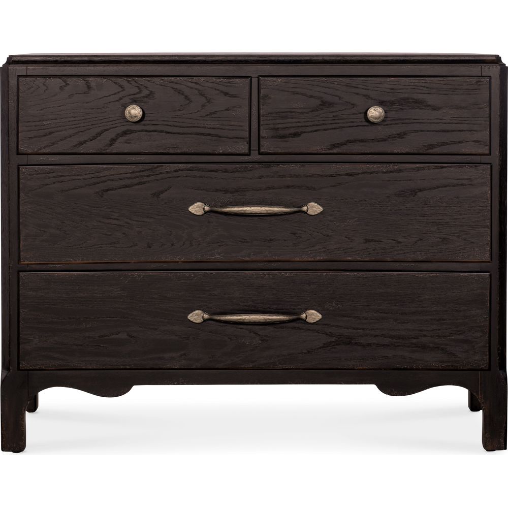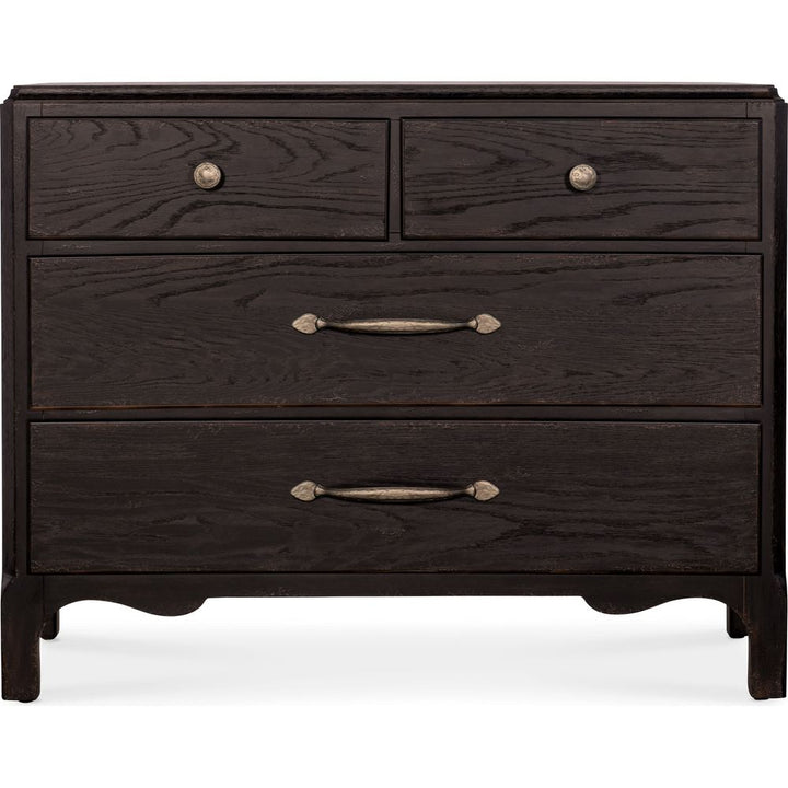 Description: In a classic, charming design with a nostalgic flair, the Americana Bachelor Chest is reminiscent of a simpler, more genteel time. It has a scalloped shaped base and is finished in a deep, dark Molasses finish on Cathedral Oak Veneers. The four self-closing drawers have the warm Honey interior finish. Metal alloy bar and knob pulls are in an antique bronze finish.
