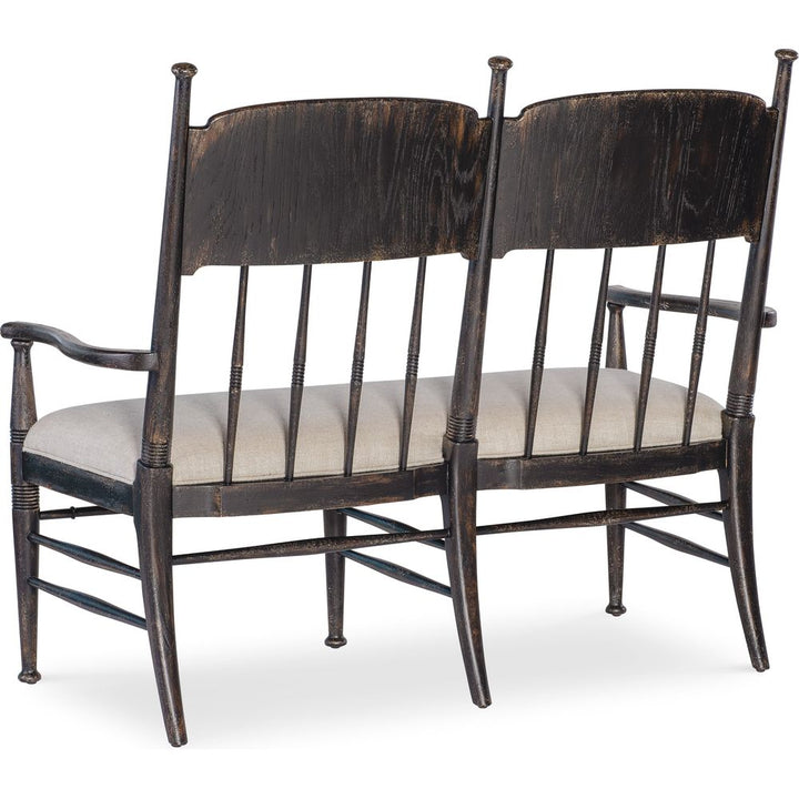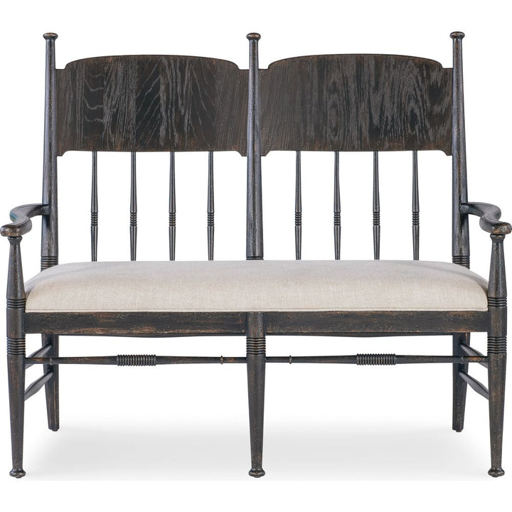 Description: Celebrating the natural beauty of a simpler time, the inviting Americana Dining Bench has a nostalgic design including a spindle-style back with carved accents on the spindles and frame. The fabric seat is upholstered in the linen Biscuit performance fabric with welt trim. Crafted of Oak Veneers, the bench is finished in the Molasses finish, with the look of pieces passed down through the family over time and revealing the rich oak character beneath.