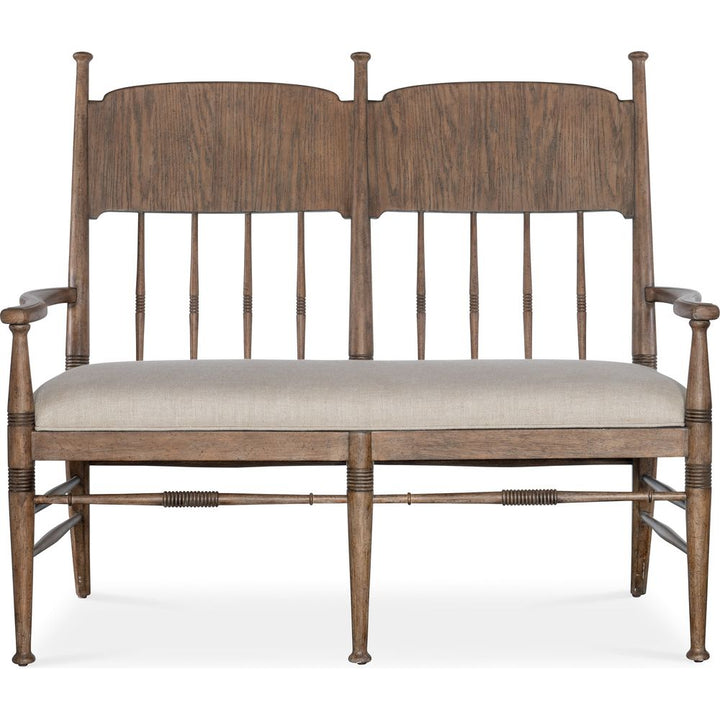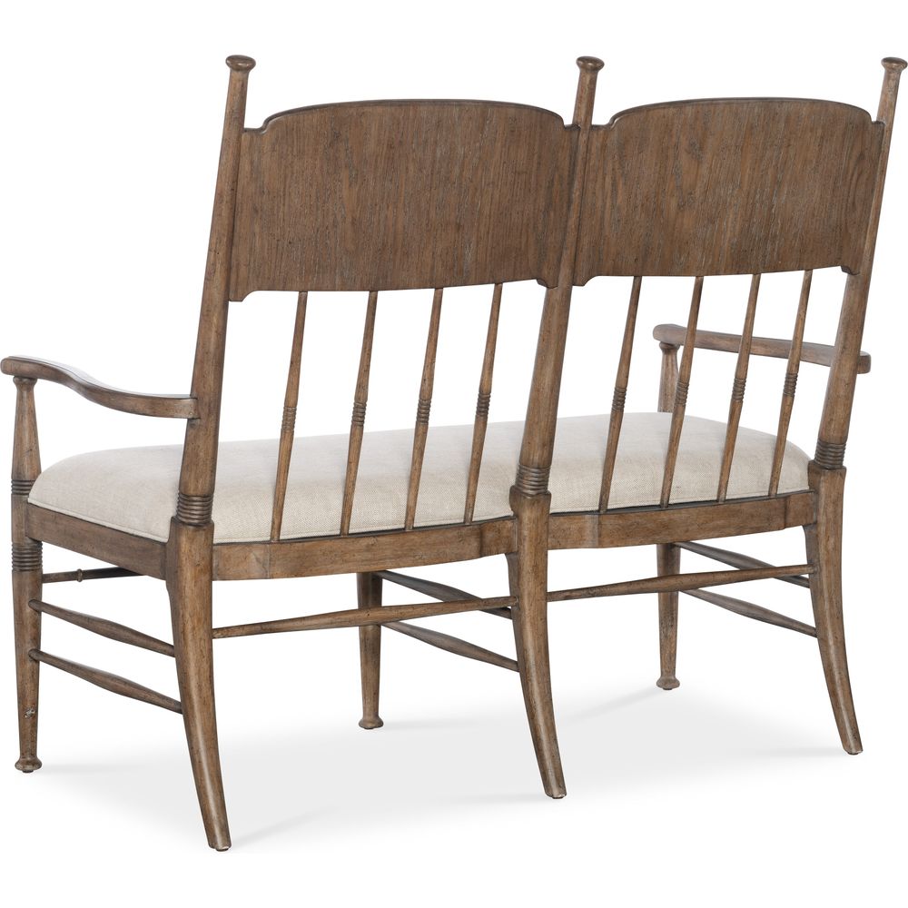 Description: Celebrating the natural beauty of a simpler time, the inviting Americana Dining Bench has a nostalgic design including a spindle-style back with carved accents on the spindles and frame. The fabric seat is upholstered in the linen Biscuit performance fabric with welt trim. Crafted of Oak Veneers, the bench is finished in the gentle, warm brown Honey finish, with the look of pieces passed down through the family over time and revealing the rich oak character beneath.
