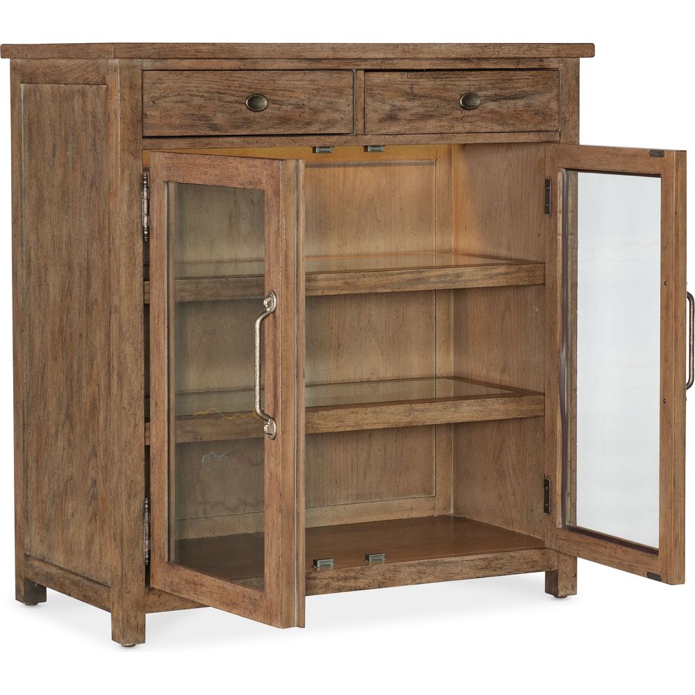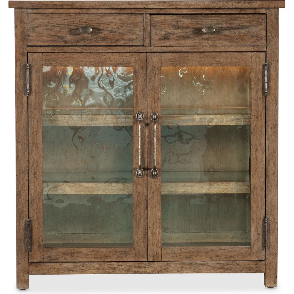 Description: Reimagining an historical design with a fresh take on finish, function and form, the Americana Pie Chest has two wood-framed seeded glass doors with magnetic catches and a light in the door area. Crafted of Oak Veneer, it is finished in the gentle warm Honey tone with distressing for authenticity. Measuring 40 inches high by 38 inches wide, it has two self-closing drawers and two adjustable wood framed tempered glass shelves with plate grooves. Metal alloy oval and bar pulls in an antique bronze finish.