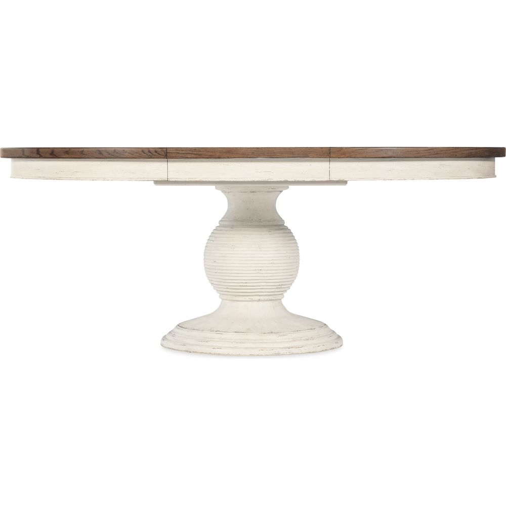 Description: Combining the time worn white Daisy finish on the base and the warm Honey finish in a soft brown tone on the top, the Americana Round Pedestal Dining Table harkens back to a simpler, more genteel time. Crafted of Oak Veneers with a Solid-Wood Edge Top, it has a carved pedestal base. With the 22-inch leaf in place, the table extends to 76 inches round and accommodates up to two coordinating benches and two armchairs and up to 8 coordinating armchairs or side chairs. Without the leaf, it accommodates up to 6 coordinating arm or side chairs.