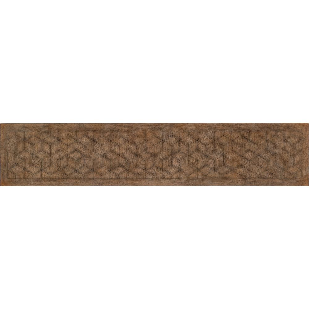 Description: Reimagining an historical design with a fresh take on finish, function and form, the stunning Americana Trestle Console Table has a two-tone finish combining a parquet Oak Veneer top design with a Molasses finish on the base. Capturing the essence of a well-loved heirloom, the deep dark Molasses tone over Cathedral Oak Veneers adds warmth, while the variations in color reveal the natural beauty of the wood beneath. The base is an interlocked carved stretcher design. At only 16 inches deep, this striking piece fits into even tight spaces. Solid-wood edge top.