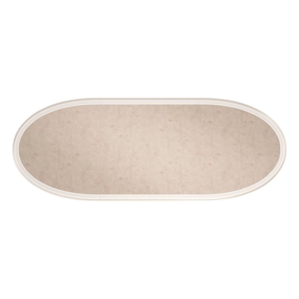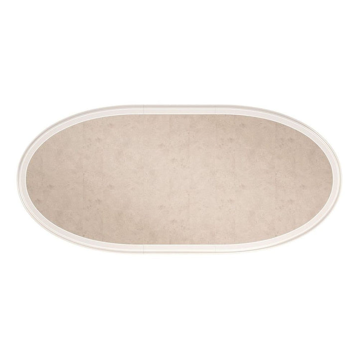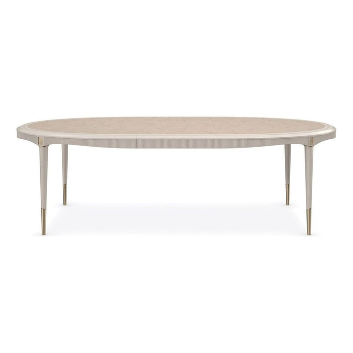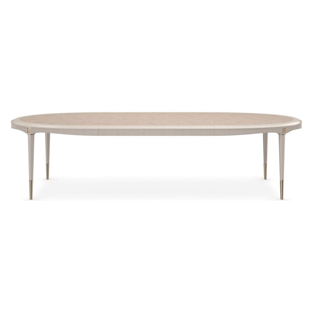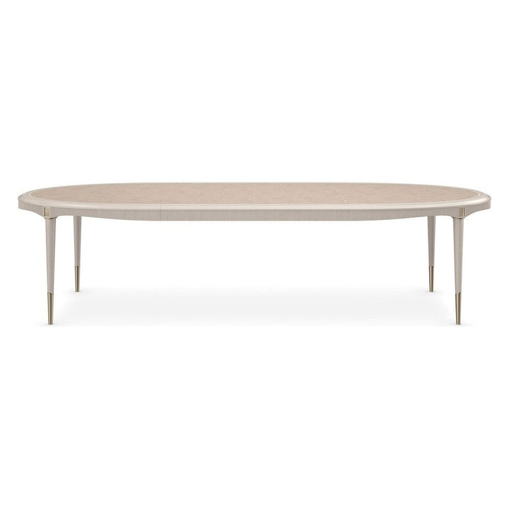 With an elegant oval shape accentuated by a gently flowing, reeded apron, this extension dining table celebrates attention to detail and functionality. Its expansive top is intricately crafted from pieced maple burl veneers, trimmed in a cream silkscreen banding to complement its Matte Pearl frame. Corner blocks add a distinctive finishing touch atop tapered round legs, capped in a Whisper of Gold metal ferrule to emulate the apron's subtle curves. Comfortably seats 12 when fully extended.