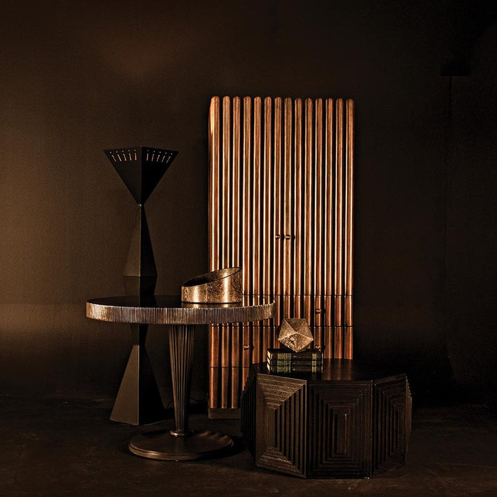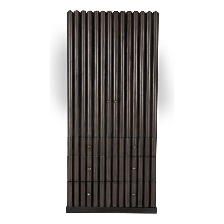 A versatile storage piece, the Amunet hutch features bold reeding with our Washed Pale strain finish that allows the beauty of the wood to peek through. Solid Pale finish base. Antique brass knobs.